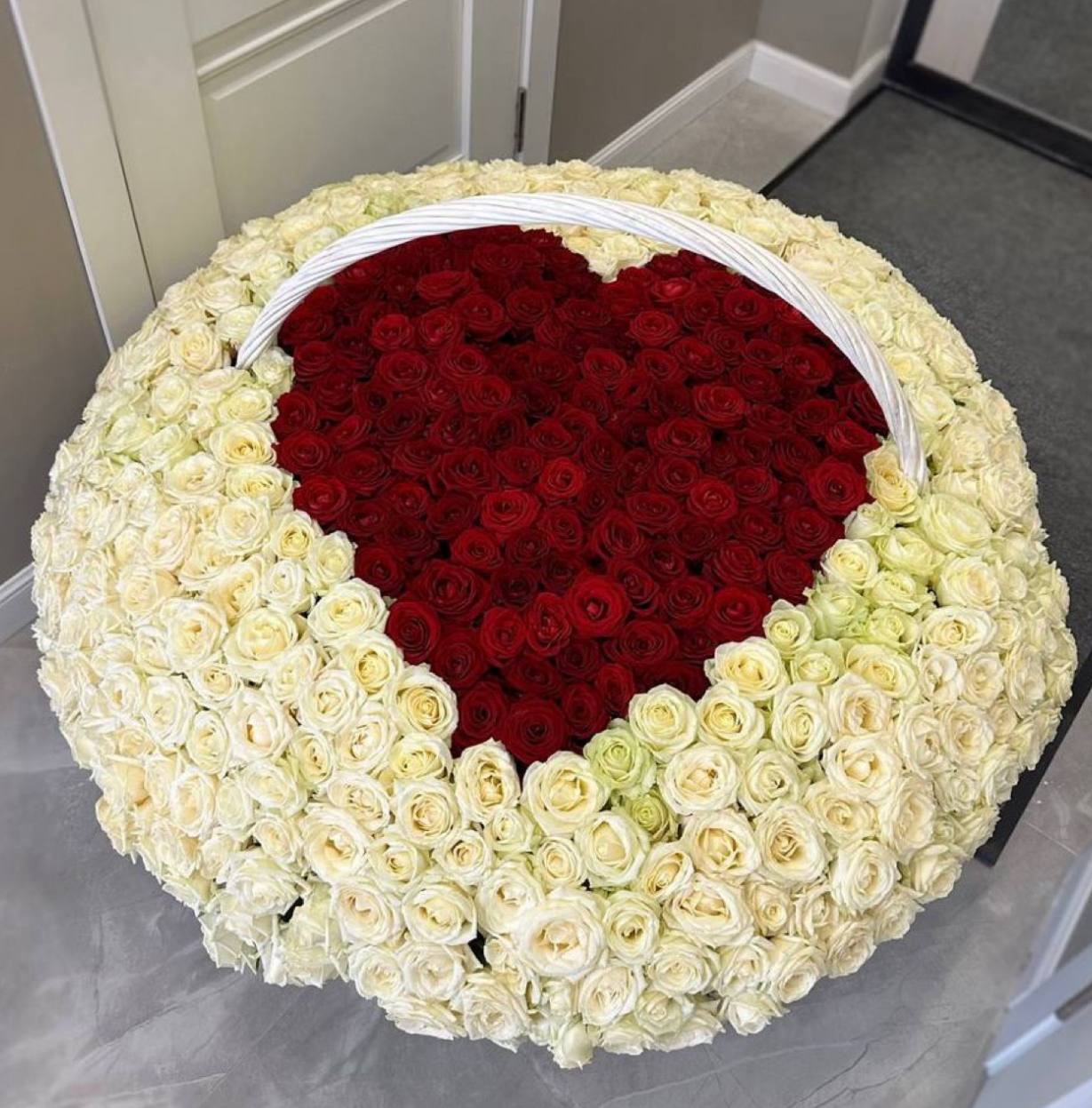 Сто один бутон сорта Athena собраны в монохромную композицию безупречной формы. Белый цвет раскрывается во всей своей чистоте, создавая впечатление спокойной уверенности.