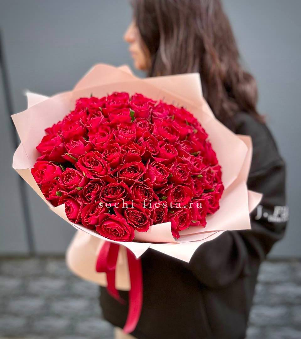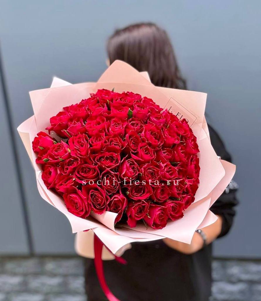 Сто одна кенийская роза в едином цилиндре — это впечатляющий масштаб и безупречная симметрия. Плотный силуэт и насыщенный цвет создают мощное визуальное присутствие. Композиция звучит сама за себя.