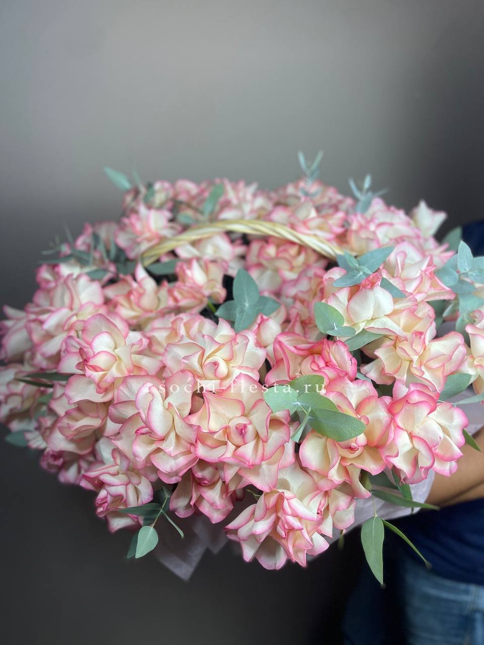 Пятьдесят один цветок в плетеной корзине дополнен серебристым эвкалиптом. Ветки зелени обрамляют каждый бутон и добавляют воздуха между головками роз. Устойчивая форма удобна для размещения на столе.