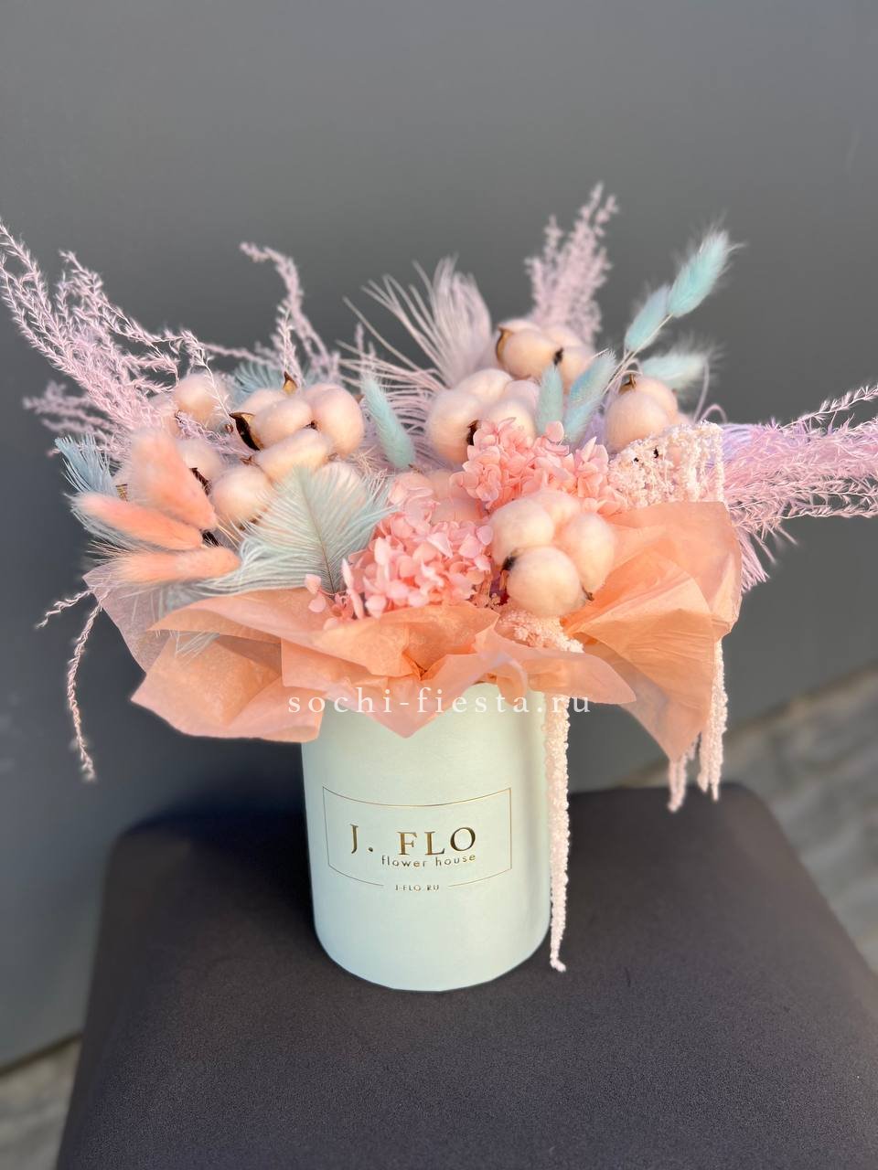Воздушная композиция с пушистым лагурусом и хлопковыми коробочками в цилиндре. Перья добавляют легкости, амарант уравновешивает общий ритм. Сохраняет форму месяцами.