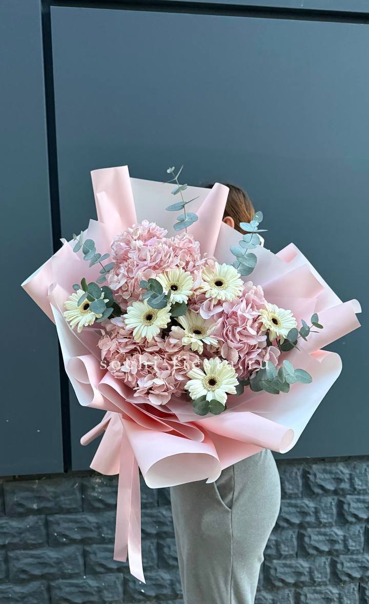 Гортензия создаёт воздушную базу, а герберы добавляют яркие точки цвета. Эвкалипт заполняет пространство между бутонами и придаёт композиции завершённость. Букет выглядит свежо и легко.