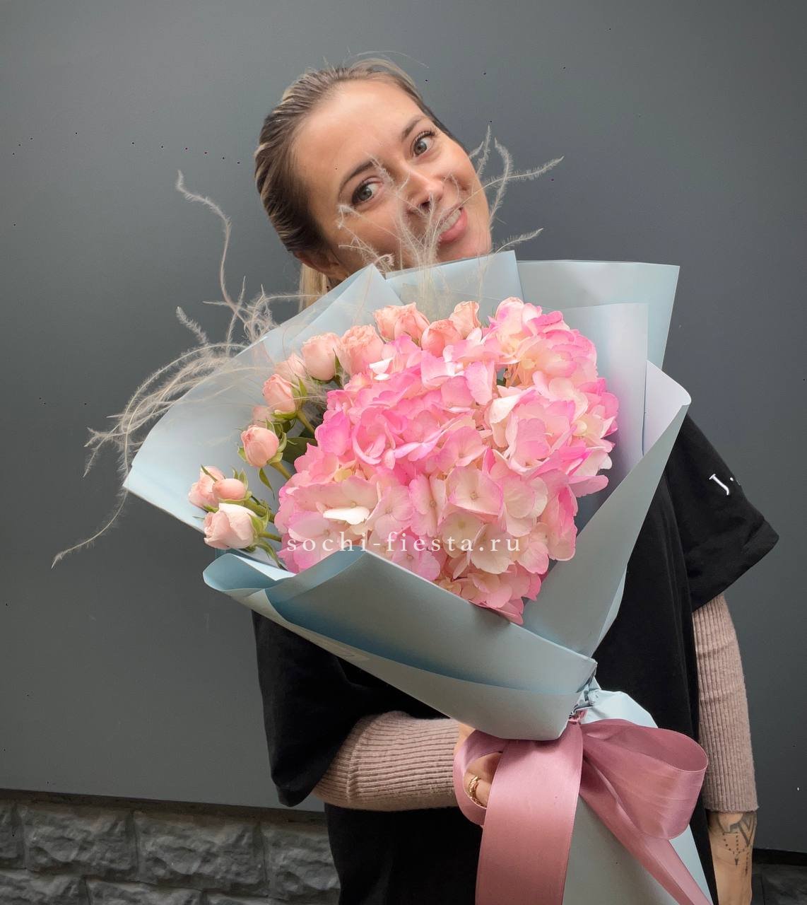 Пышная гортензия задает объем, а французские розы и эустома создают многослойную глубину. Диантусы добавляют графичные точки, эвкалипт обрамляет композицию мягкими линиями.