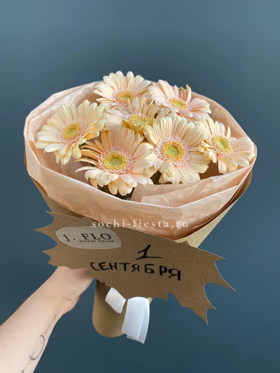 Семь ярких гербер собраны в компактную форму и упакованы в натуральный крафт с тишью. Цветные головки создают праздничное настроение первого учебного дня.