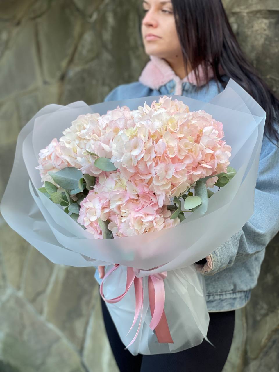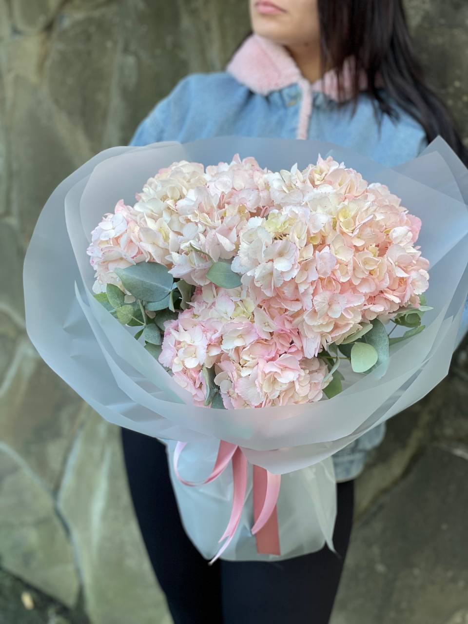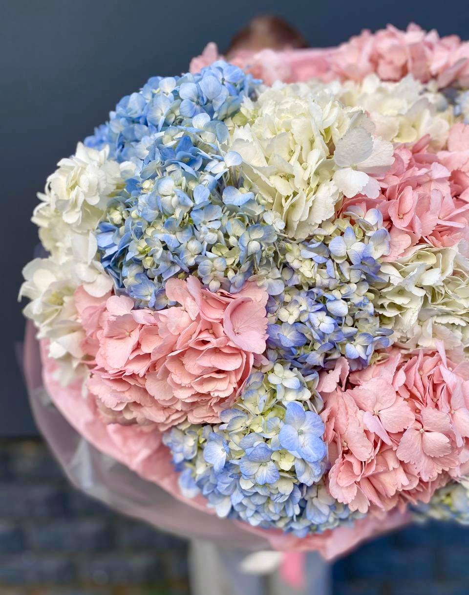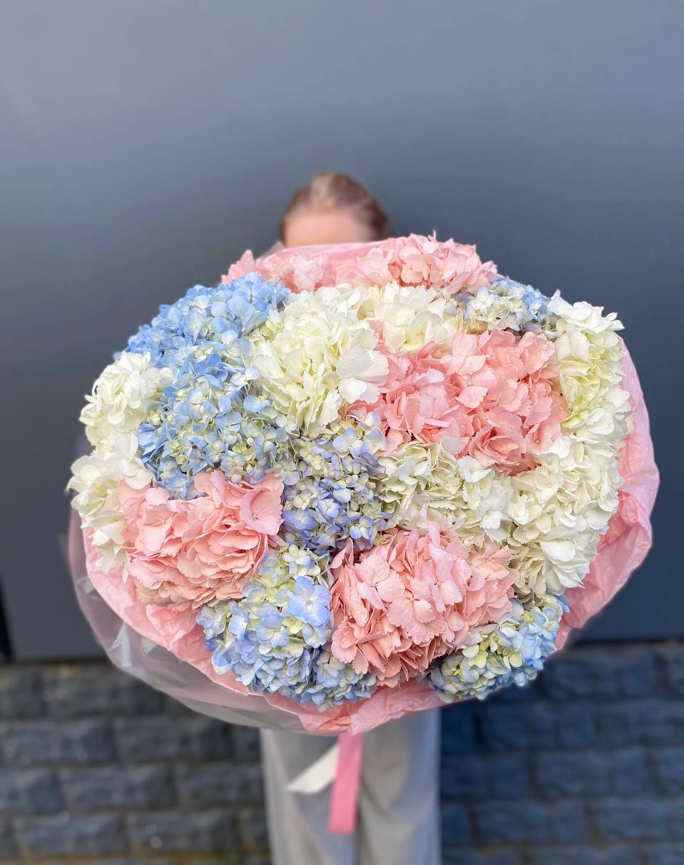 Девятнадцать соцветий гортензии собраны в объемную композицию с естественной воздушностью. Каждая головка раскрывается множеством мелких лепестков, создавая плотное цветовое облако.