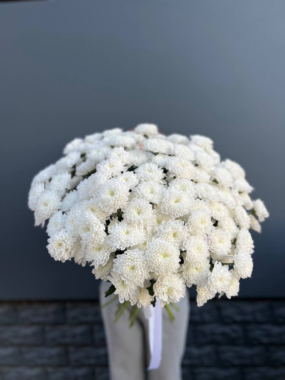 Девять кустовых хризантем сплетаются с пушистыми колосками лагуруса в воздушную композицию. Мягкие текстуры и природная простота создают ощущение прогулки по летнему полю.