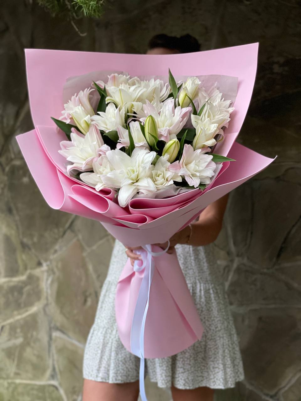 Девять махровых бутонов с плотно уложенными лепестками создают объёмную композицию. Пионовидные лилии раскрываются постепенно, удерживая форму несколько дней. Букет выглядит самодостаточно и занимает заметное место в интерьере.