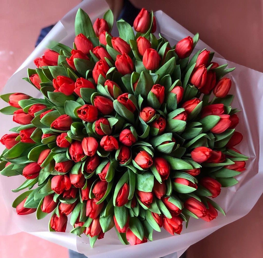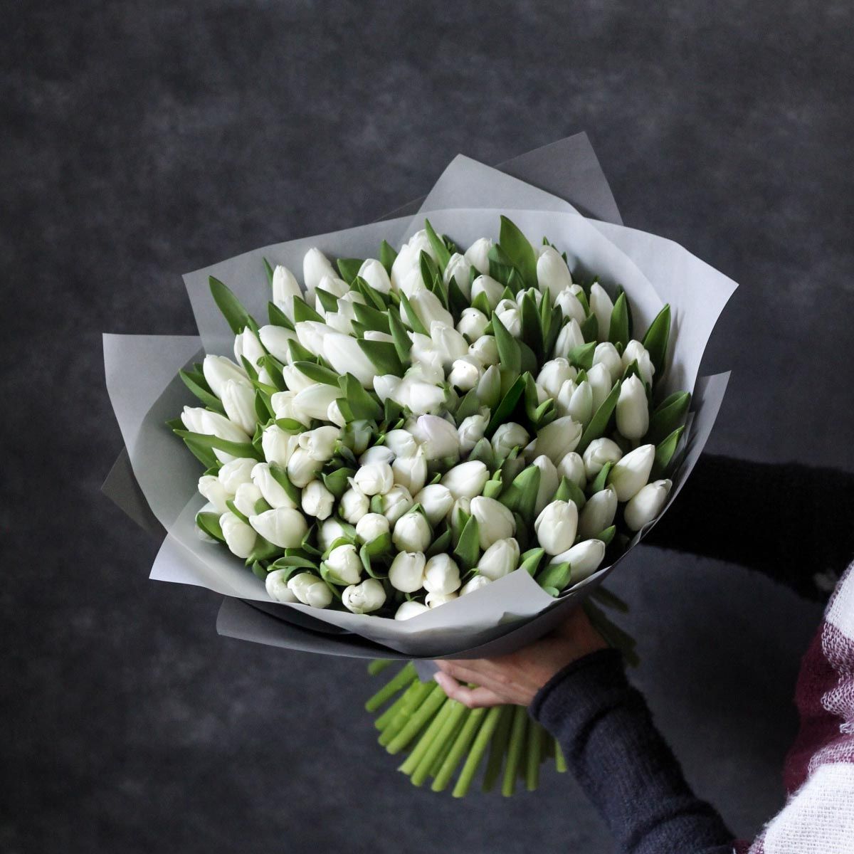 Сто один белоснежный тюльпан собран в плотную охапку с безупречной геометрией. Классическая упаковка сохраняет естественную красоту бутонов и подчёркивает масштаб композиции.