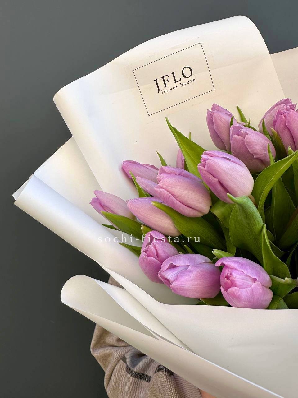 Двадцать пять тюльпанов сиреневого оттенка собраны в плотный монохромный букет. Бутоны свежие и упругие, каждый стебель направлен строго вверх. Лаконичная композиция для тех, кто ценит чистоту линий и весеннюю свежесть.