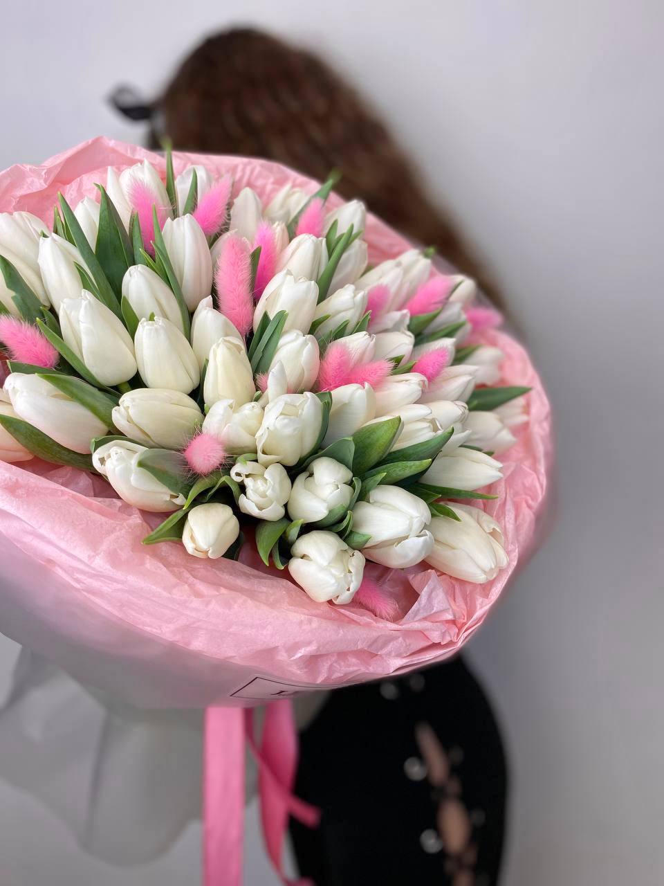 Пятьдесят один тюльпан собраны в плотную округлую форму. Белые бутоны создают объёмное облако с чёткими краями. Монохромная композиция заполняет пространство спокойной энергией.