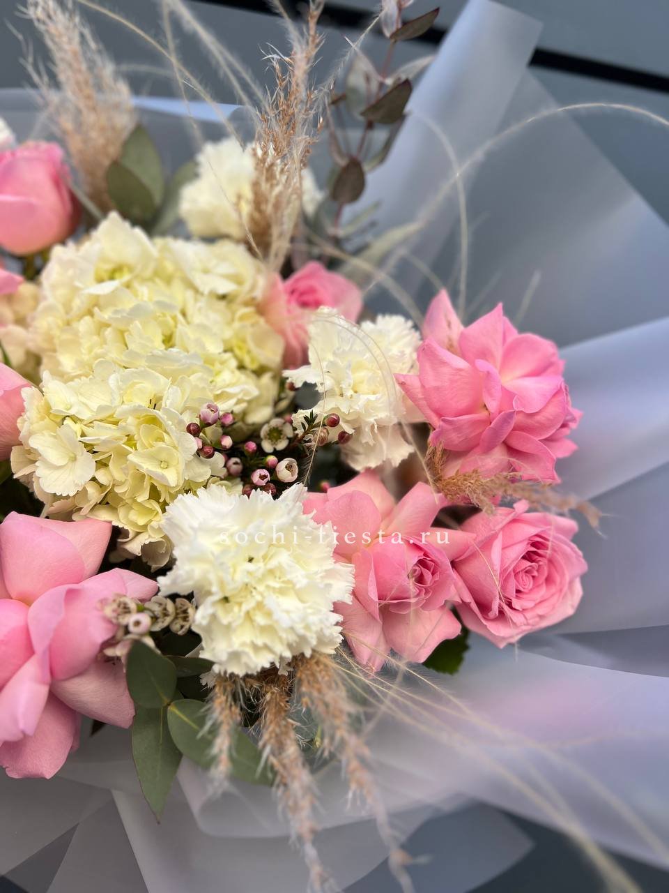 композиция из гортензий, протеи, хамелациума, роз, эвкалипта, бомбастика, диантусов в авторском оформлении.