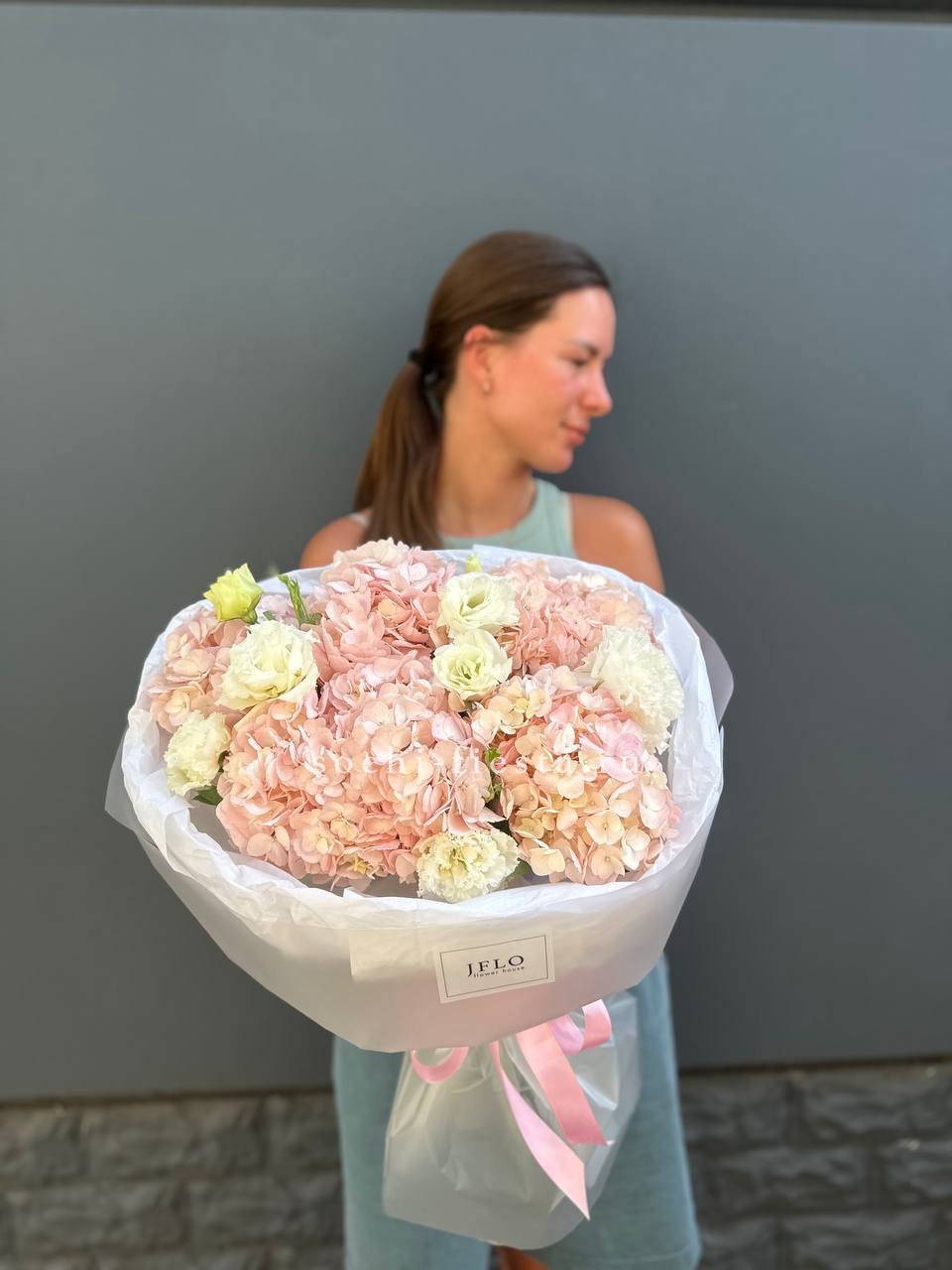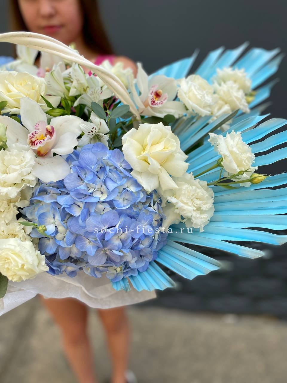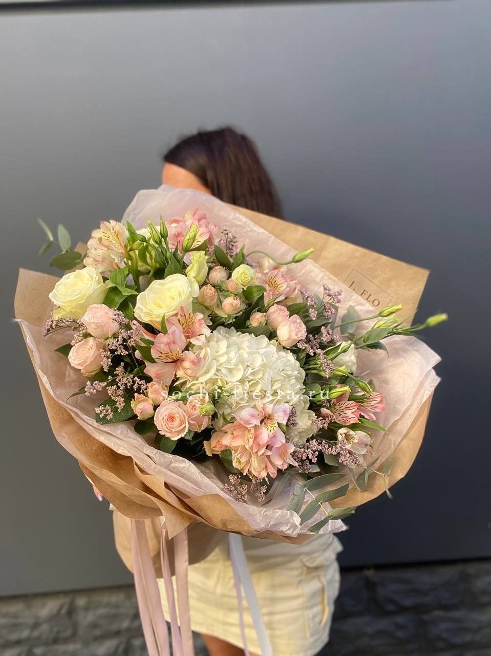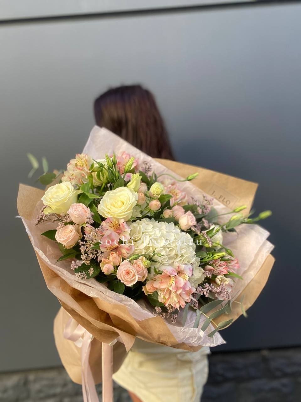 гортензии, роза одноголовая, роза кустовая, гербера, озотамнус, диантус, эвкалипт, декоративные перья, лента, дизайнерская упаковка.