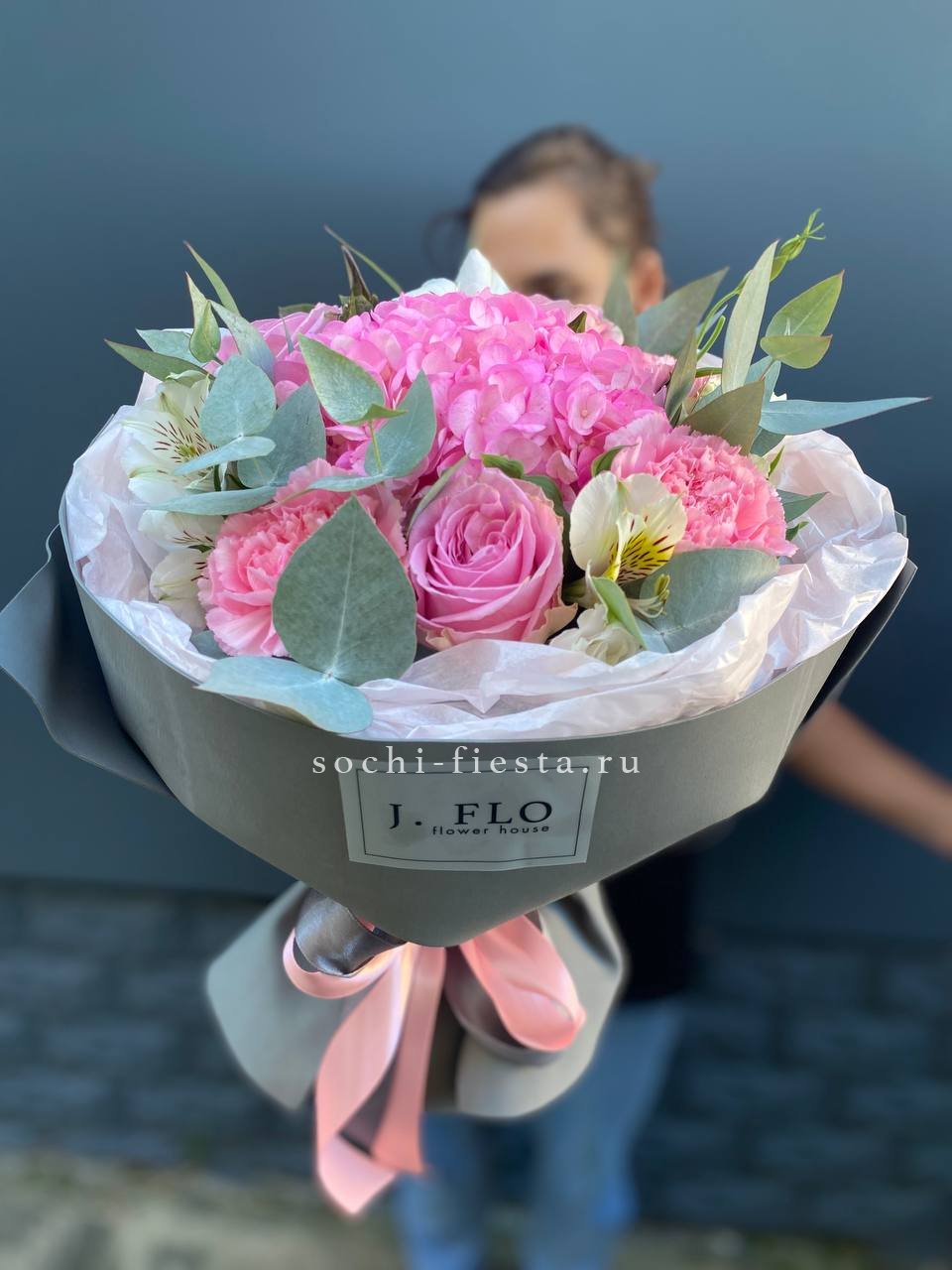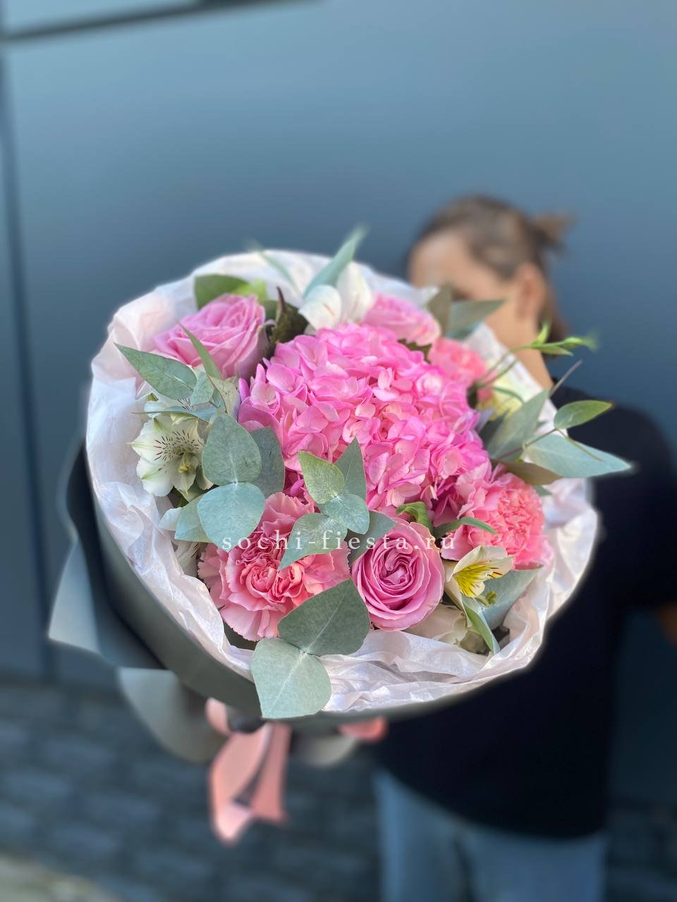 Гортензия и кустовые розы соединяются с веточками эвкалипта и ваксфлауэра в свободной композиции. Разная плотность соцветий создаёт живой ритм и природную лёгкость.