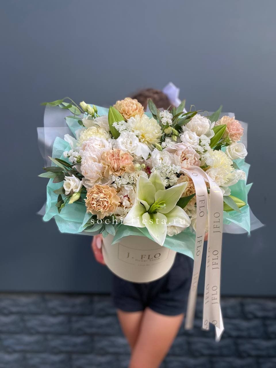 лилии, диантусы, статица, пионы или замена в не сезон эвкалипт, цилиндр.Состав может меняться в зависимости от сезона.