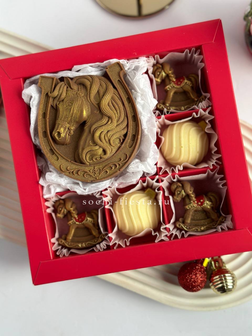 Шесть расписных шоколадных фигурок с подковой на удачу собраны в один набор. Бельгийский шоколад и ручная роспись превращают угощение в памятный сувенир высотой 14 см.