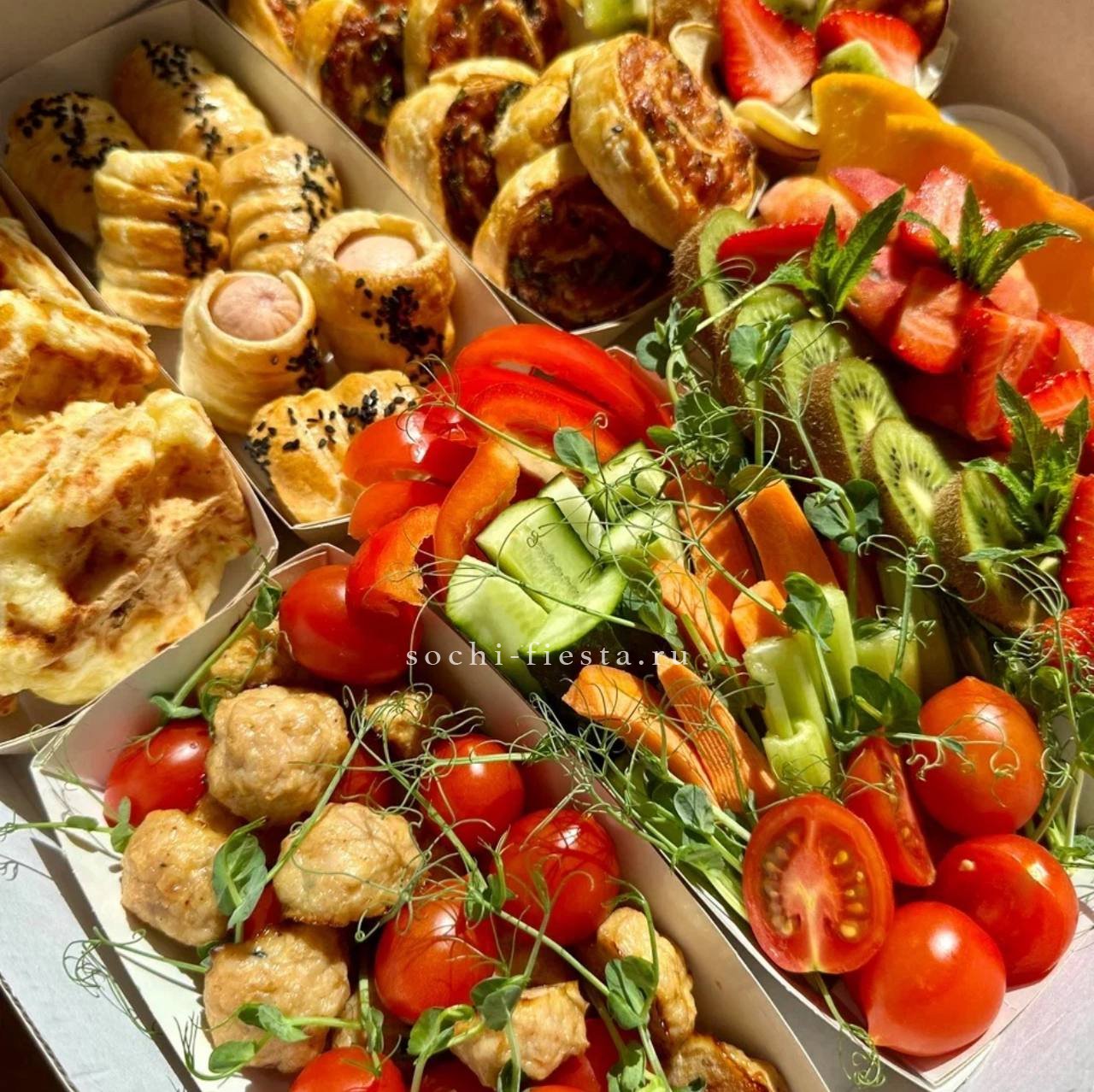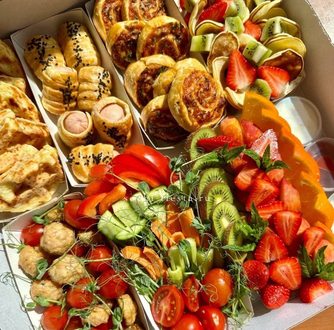 сезонные овощи с муссом из кальмара и авокадо. Щедро уложены в несколько слоев. Вес 2-2,5 кг. Бокс рассчитан на 8-10 персон.