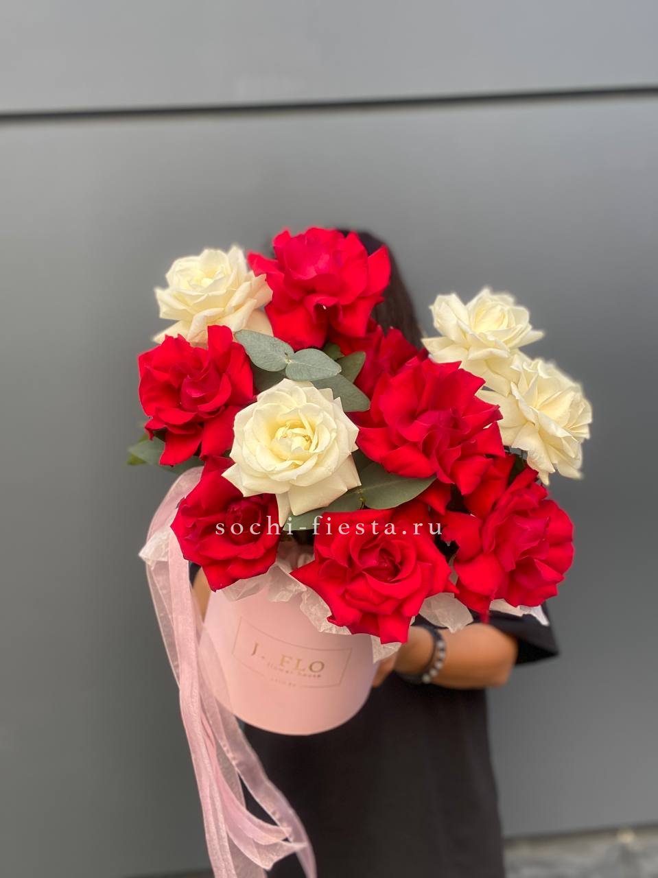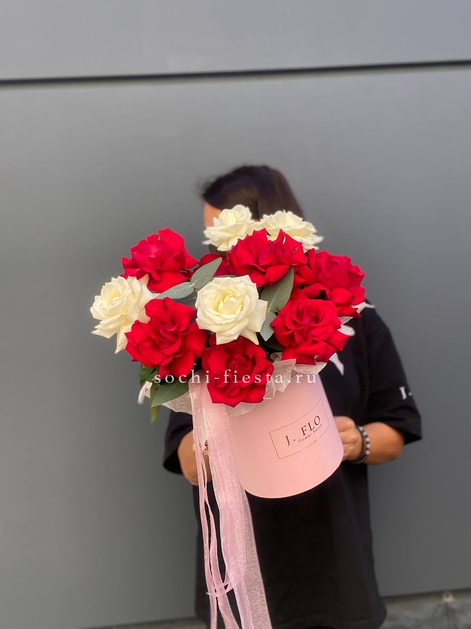 Белоснежные розы и воздушная эустома соседствуют с пышной гортензией и яркими вспышками статицы. Композиция собрана плотно, каждый цветок находит своё место в общем ритме.