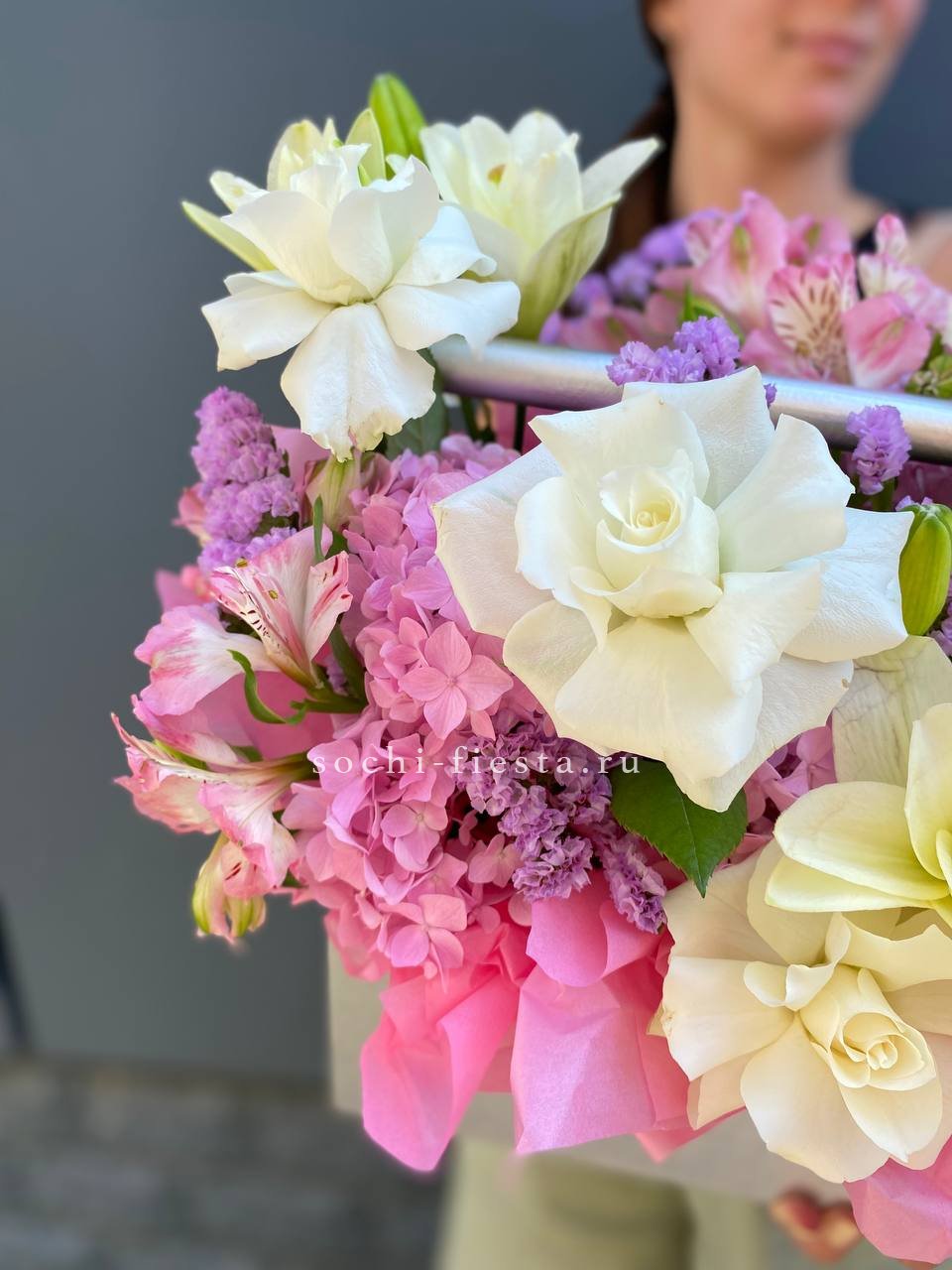 Лилии задают вертикальный ритм композиции, а французские розы и гортензия заполняют объем мягкими переходами формы. Альстромерия и статица добавляют графичности общему силуэту.