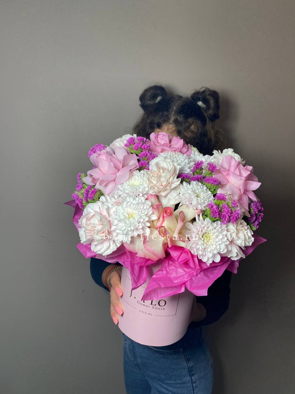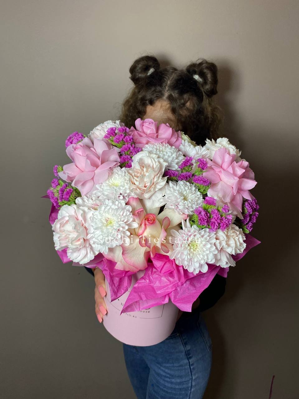 Розы, герберы и пышные соцветия гортензии в розово-голубой гамме наполняют бокс свежестью и легкостью. Каждый цветок раскрывается по-своему, создавая многослойную композицию. Готовое решение для яркого момента.