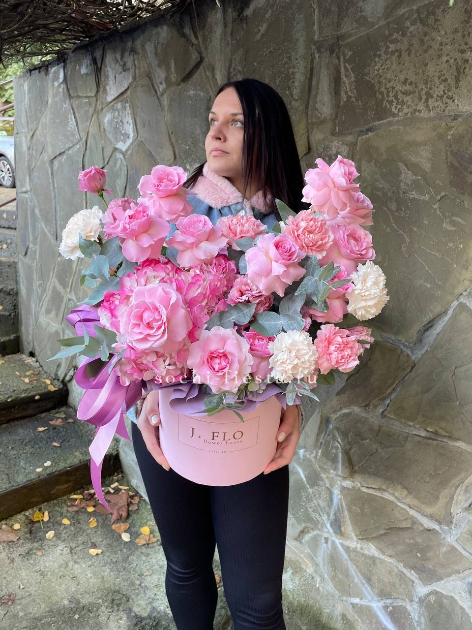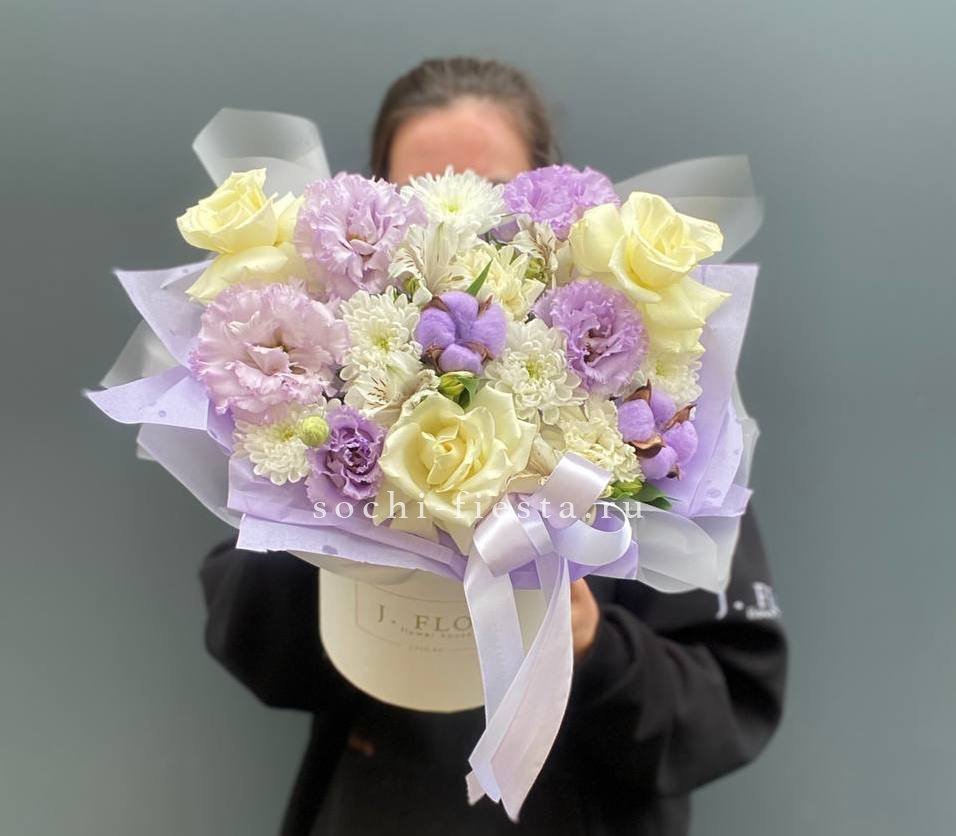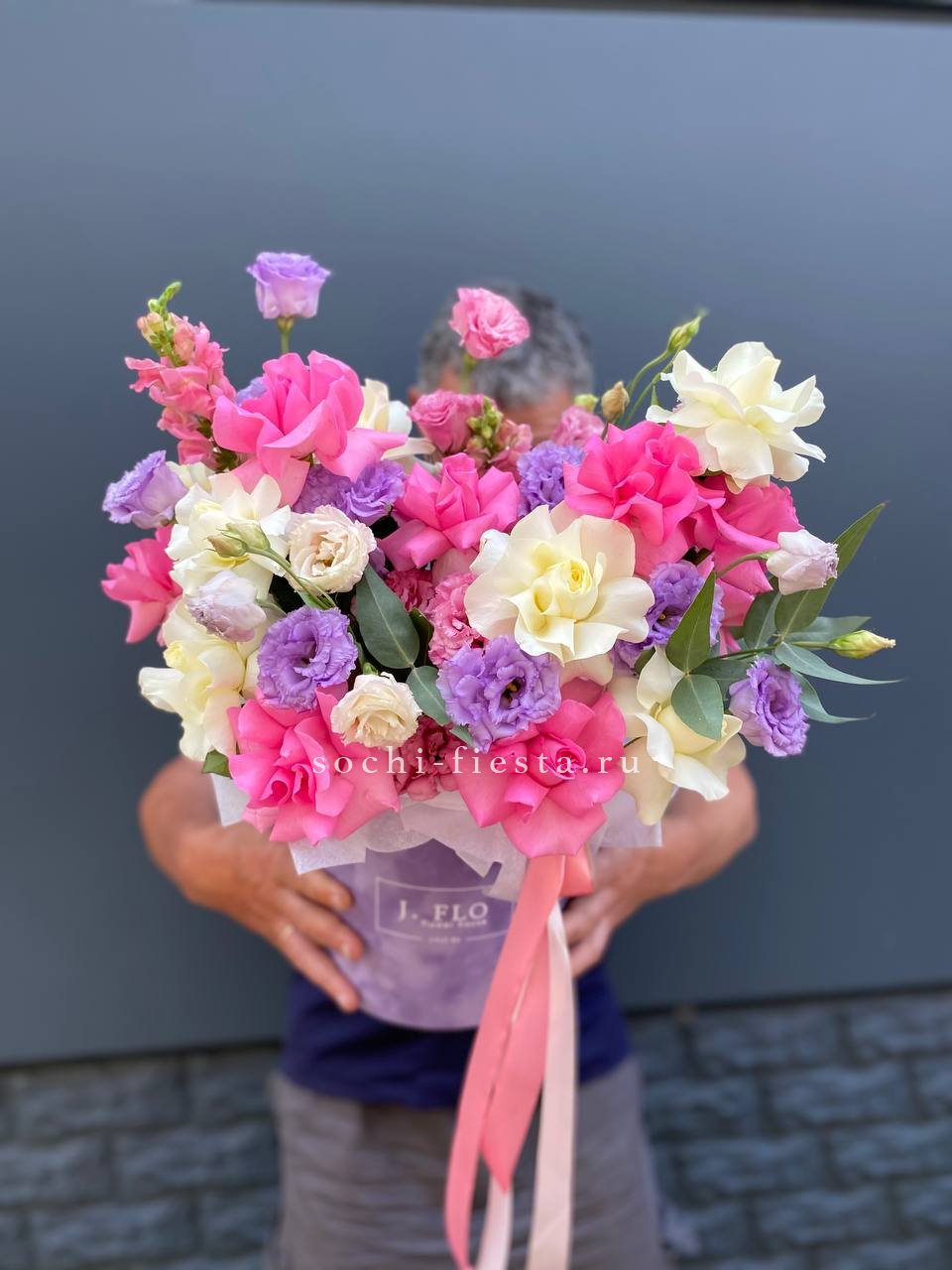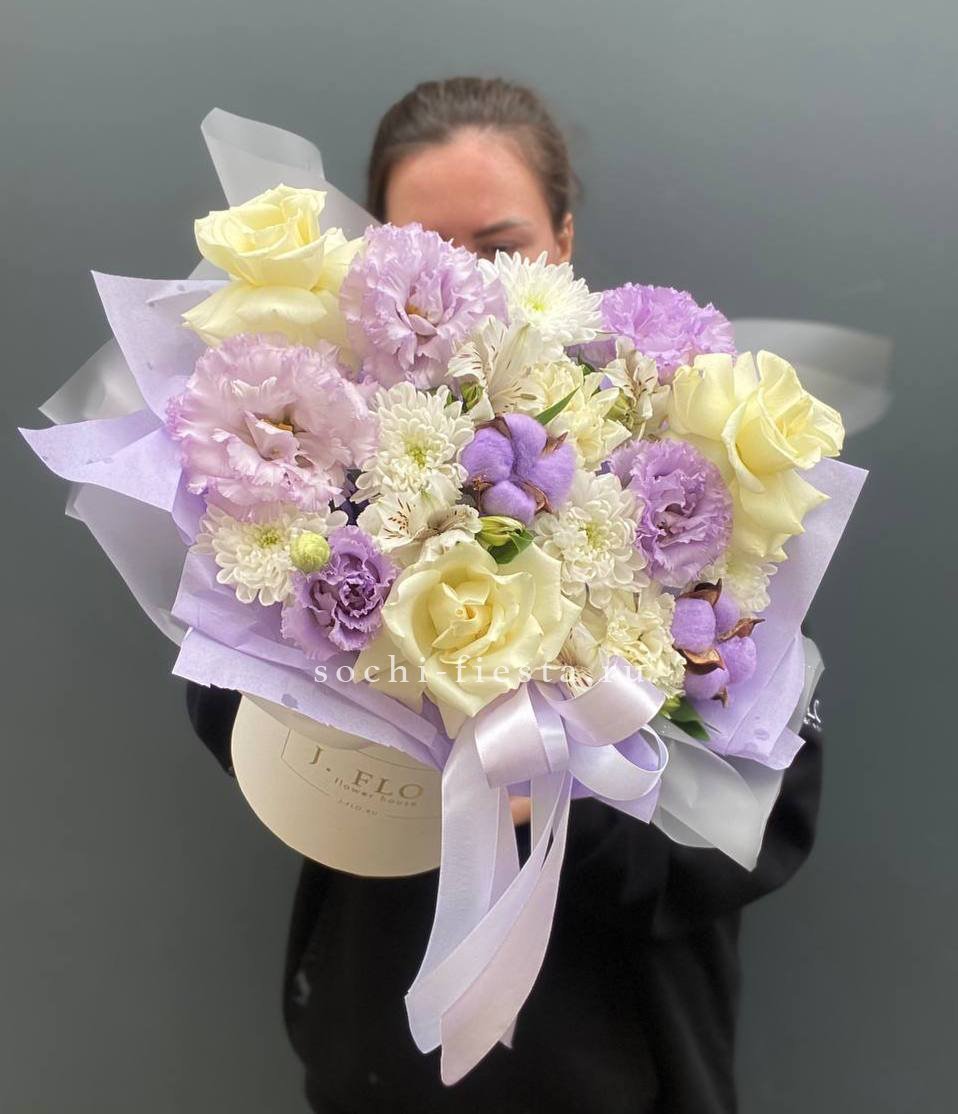 Композиция в коробке объединяет пышную гортензию, воздушную эустому и кустовые розы, Джумилию с яркими гербами и хлопком. Плотное заполнение создает округлую форму, где каждый цветок находит свое место без пустот.
