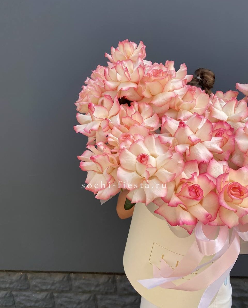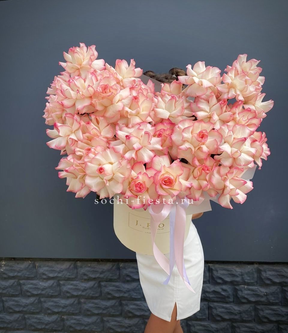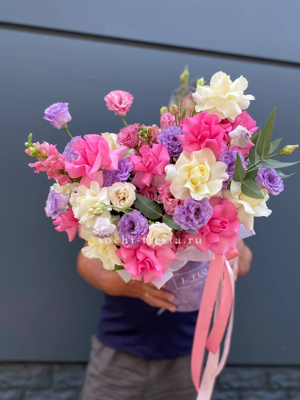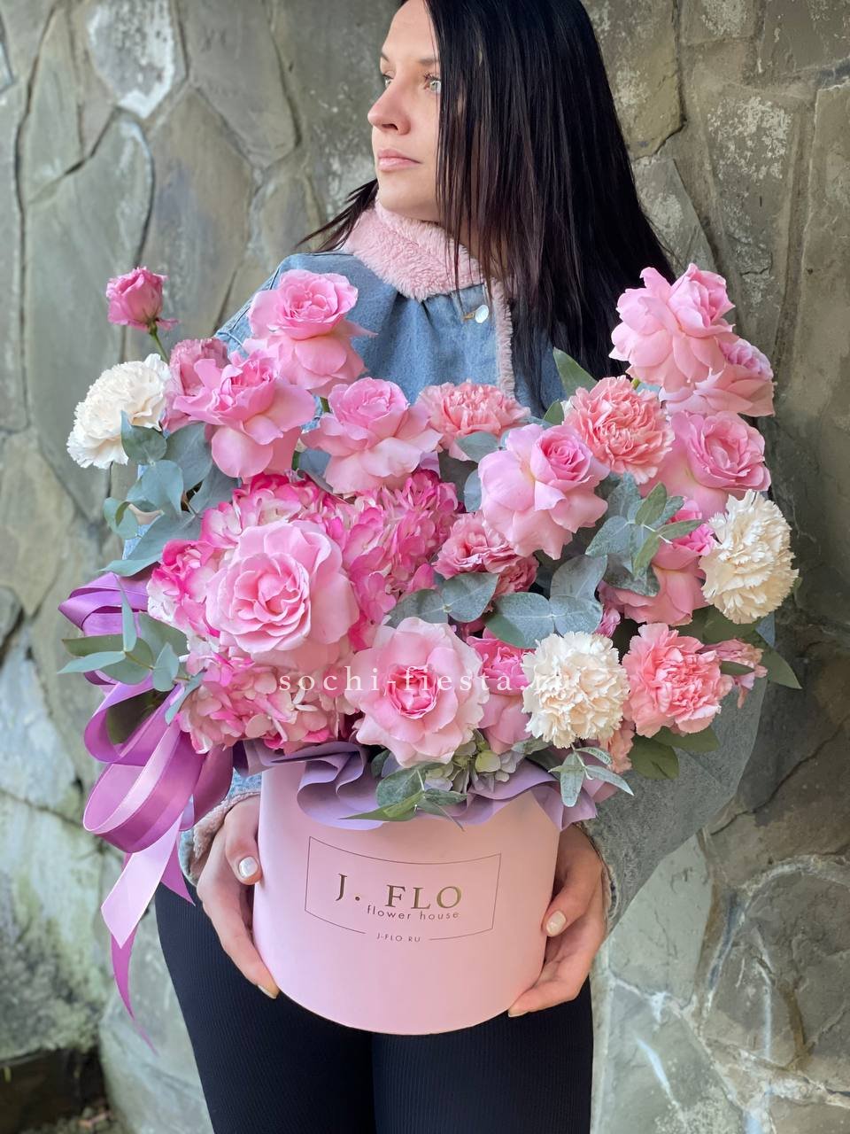 Композиция в коробке объединяет пышную гортензию, воздушную эустому и кустовые розы, Джумилию с яркими гербами и хлопком. Плотное заполнение создает округлую форму, где каждый цветок находит свое место без пустот.