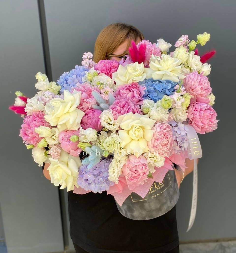 Пионы и гортензия занимают центральную часть, окружённые белыми розами и соцветиями эустомы. Маттиола вносит воздушность в плотно собранную форму.