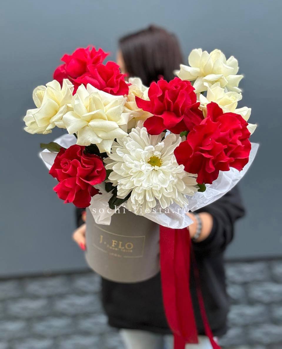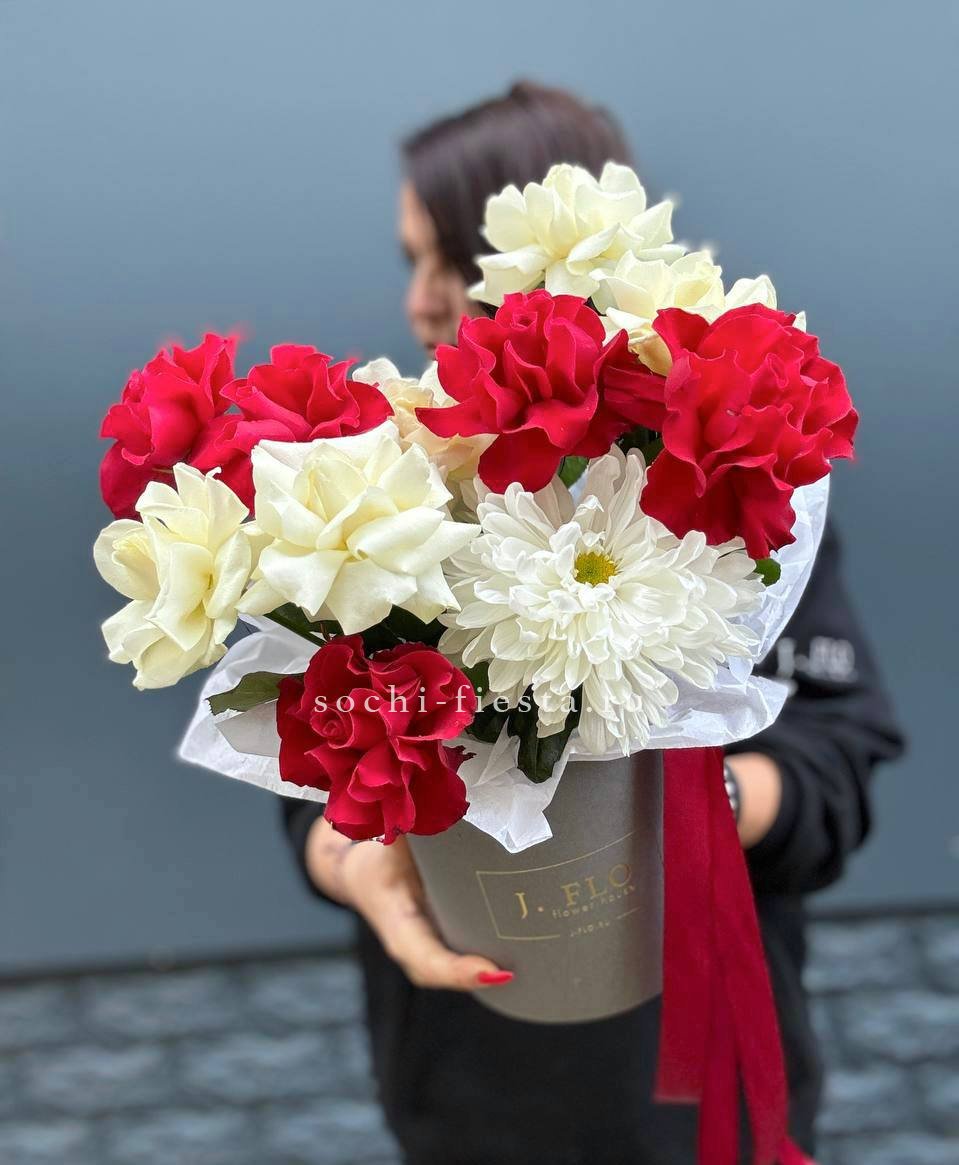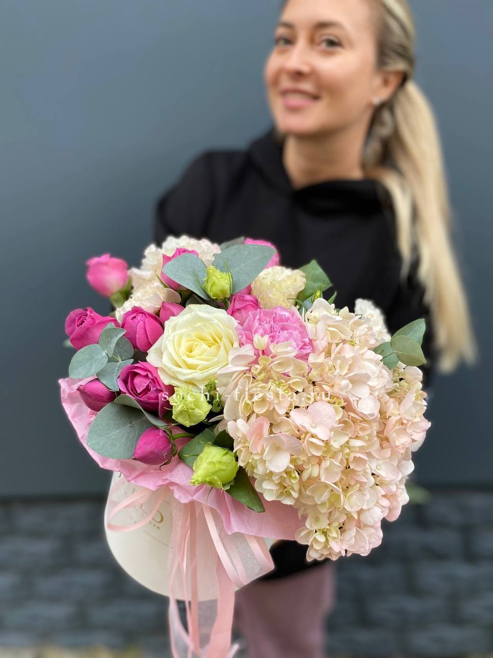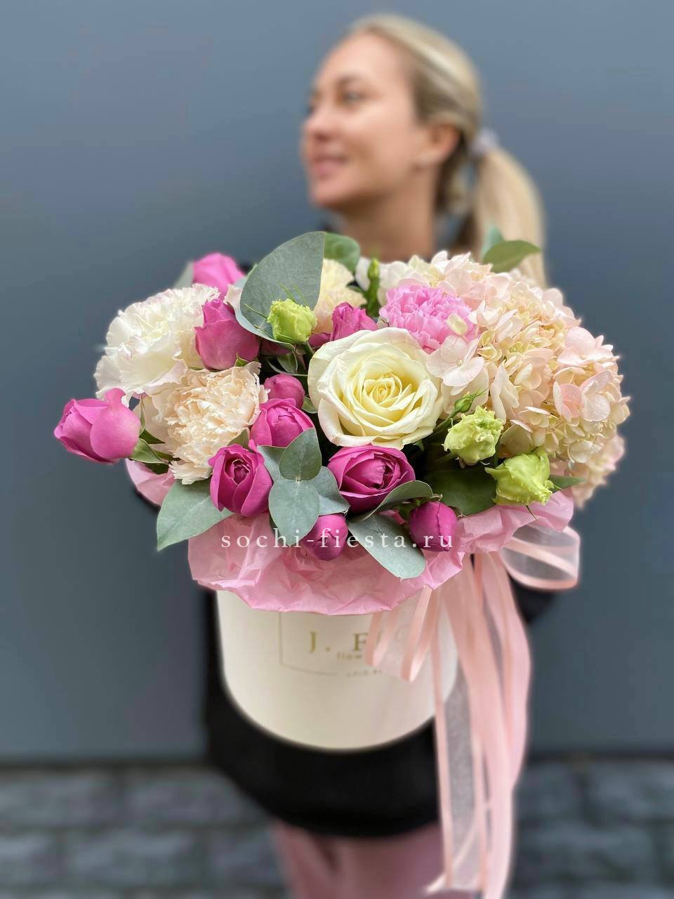 Настоящий взрыв цвета и позитива! Эта пышная и многосоставная композиция в стильной коробке притягивает взгляды богатством форм и оттенков — от нежно-розового до насыщенного белого. Это не просто цветы, а целая история о радости, празднике и восхищении. Подарок, который гарантированно произведет яркое впечатление и останется в памяти надолго.