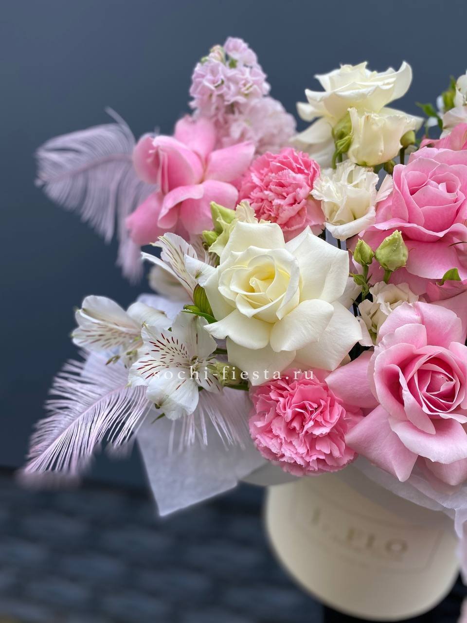 Французские розы и маттиола задают романтичный тон, а амарантус спускается мягкими каскадами за пределы бокса. Перья вносят графичную легкость в общую картину.