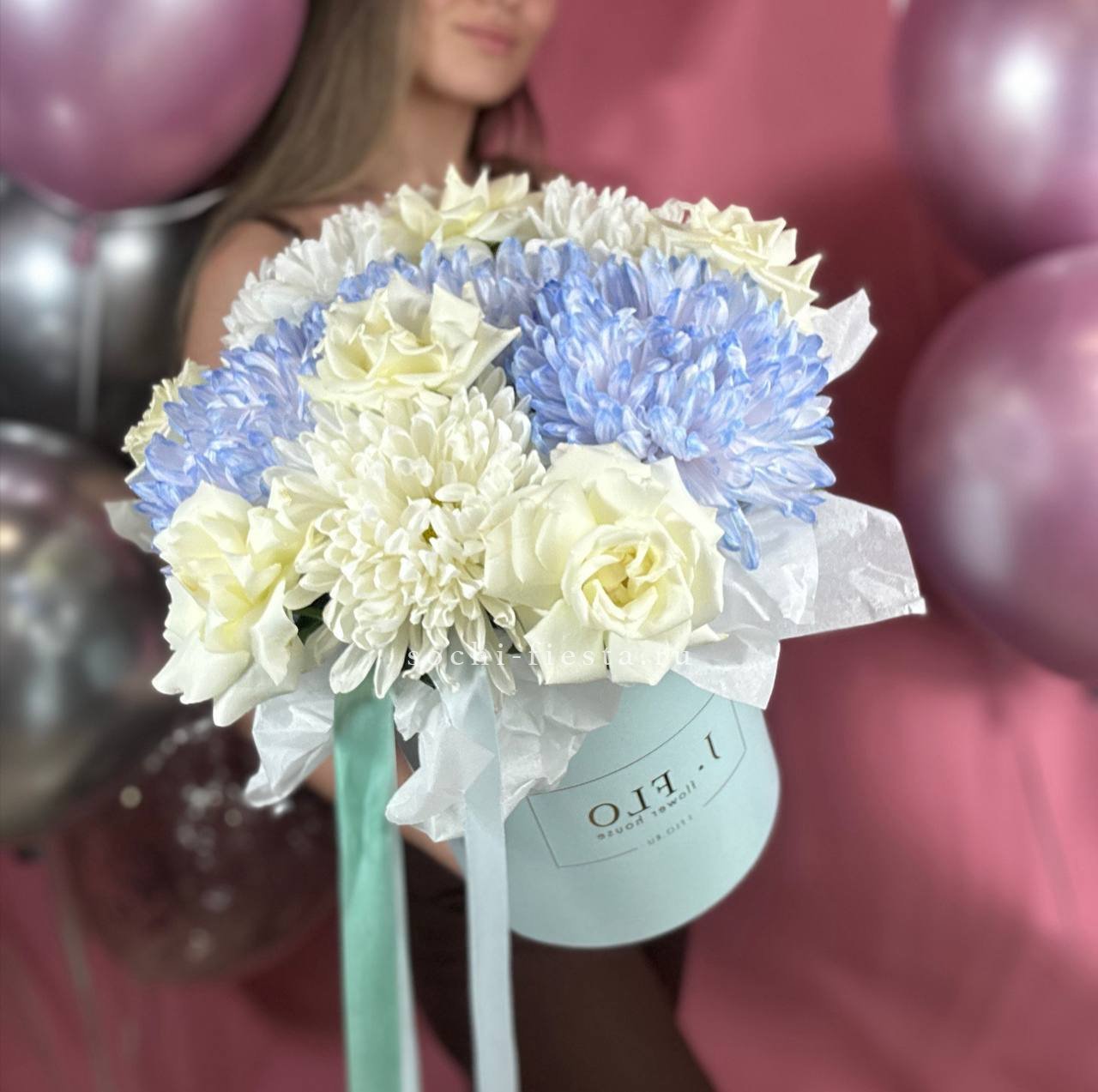 Белые розы с вывернутыми лепестками создают воздушную текстуру в сочетании с хризантемами. Композиция собрана в цилиндре и перевязана лентой. Свежее решение для светлого интерьера.