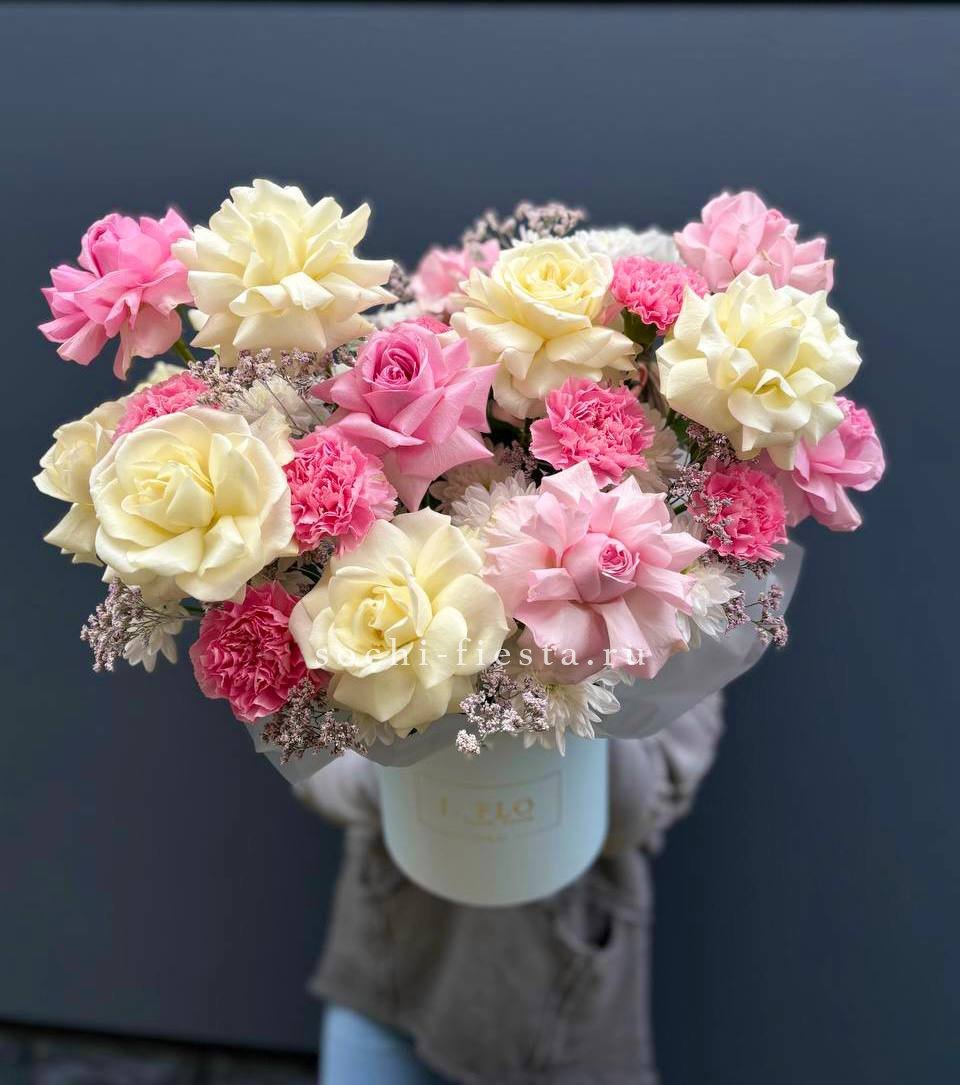 Воздушная композиция в бархатной коробке раскрывается пышными соцветиями гортензии и многолепестковыми бутонами эустомы. Розы двух оттенков создают мягкий переход от белоснежного к пудровому. Флористическая пена сохраняет свежесть каждого цветка надолго.
