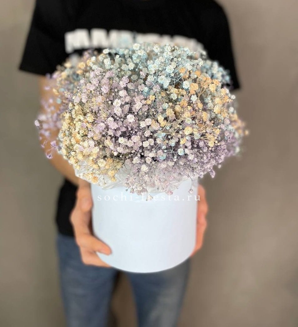 Девять облаков гипсофилы окрашены в радужные оттенки и собраны в круглую коробку. Воздушная текстура и яркие переливы создают лёгкое праздничное настроение. Композиция не требует сложного ухода.