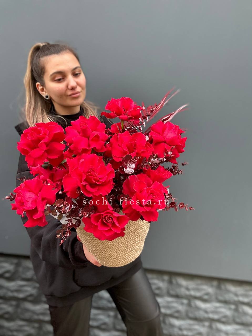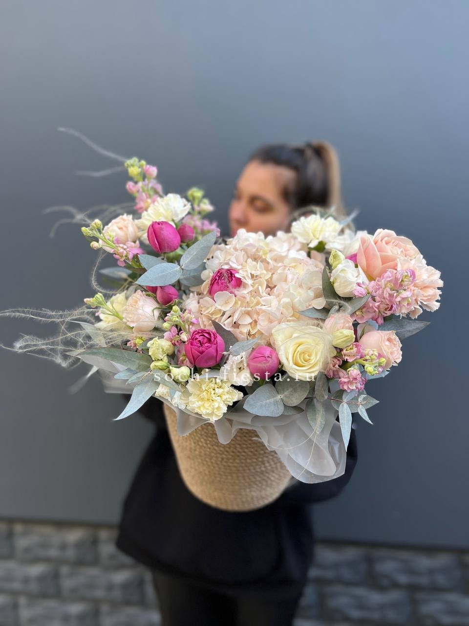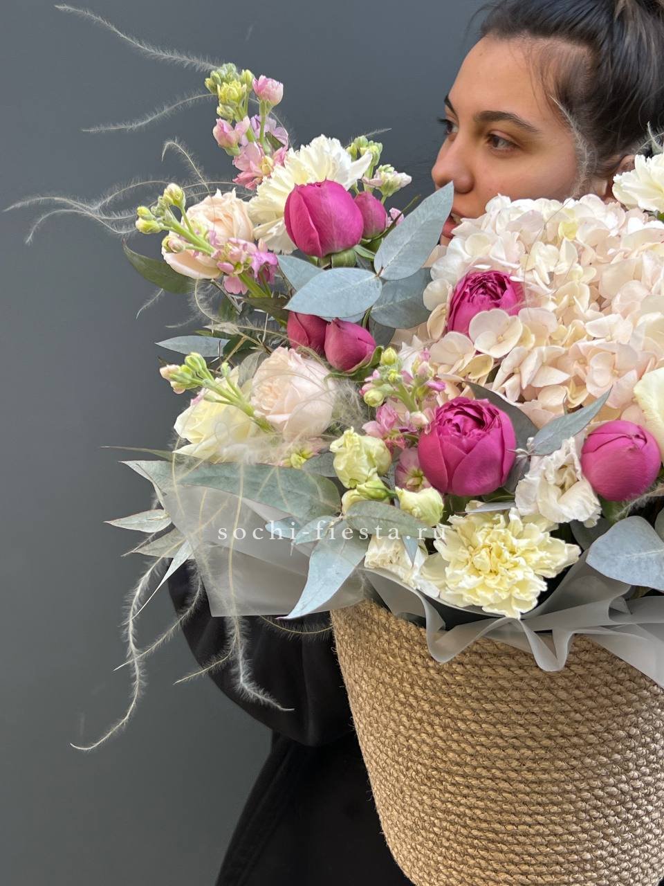 роза французская, эвкалипт, лист Чико (аналог), джутовое кашпо, оазис.