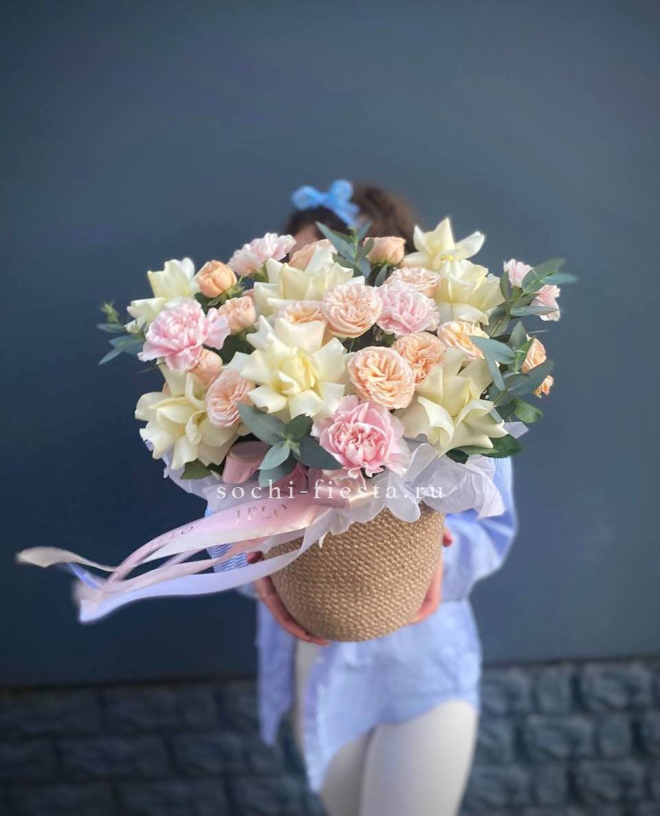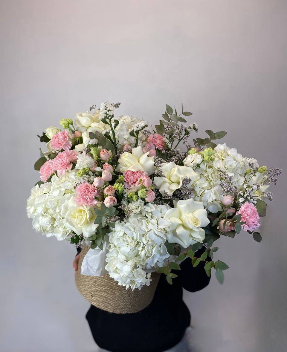 Мягкая палитра белых оттенков с вкраплениями диантуса создает воздушную композицию в натуральном джутовом кашпо. Кустовые розы добавляют объем, а эвкалипт завершает природную гармонию. Готовое решение для интерьера в спокойных тонах.