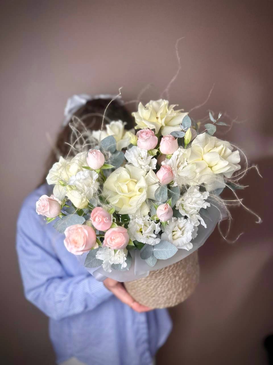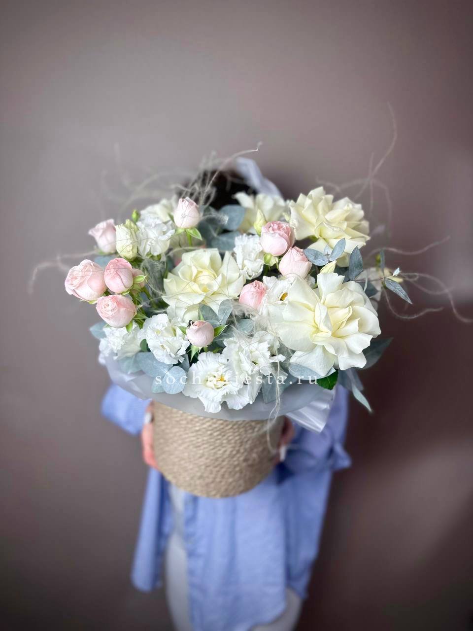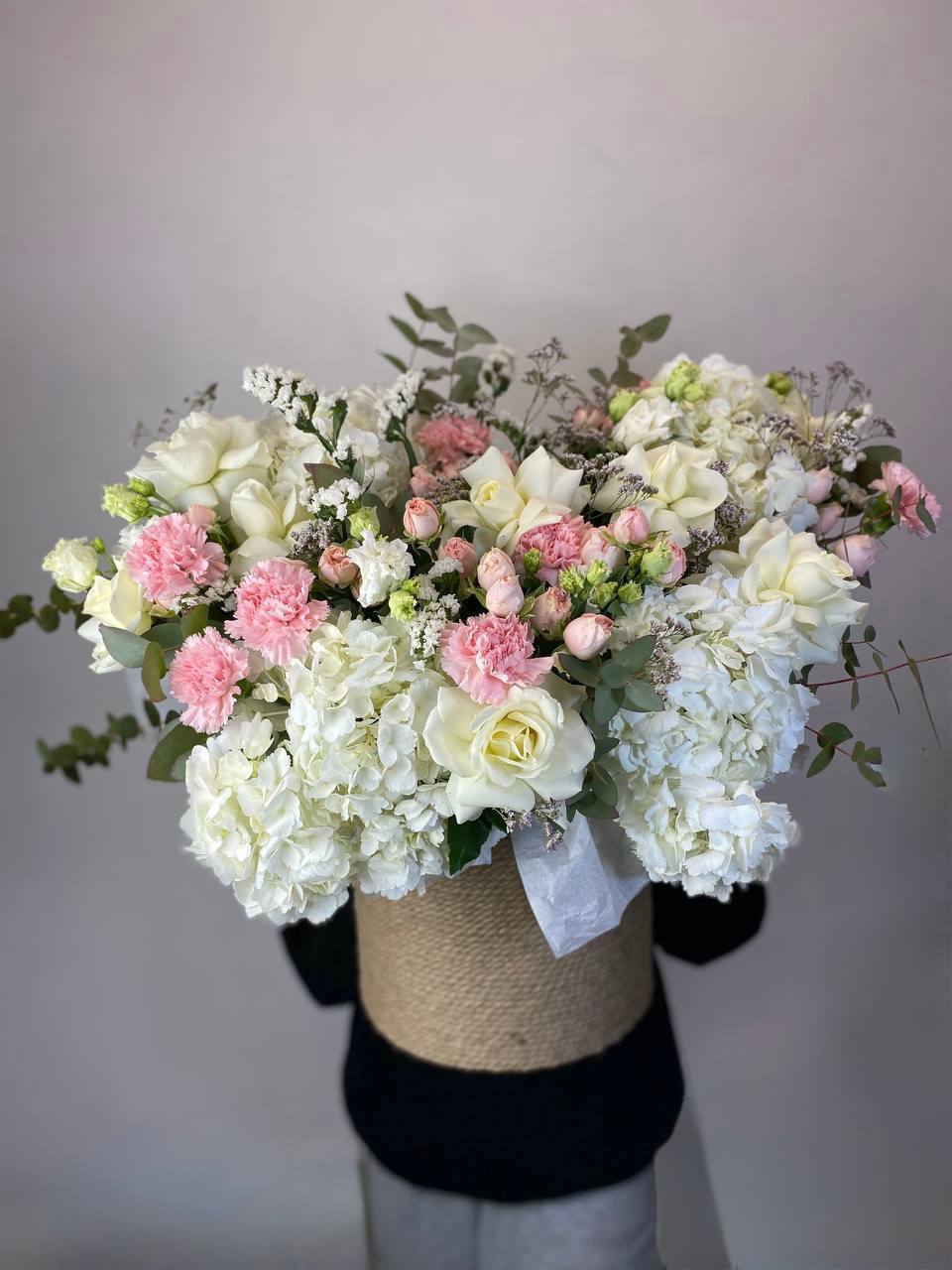 белые и кустовые розы, диантус в джутовом кашпо с эвкалиптом.