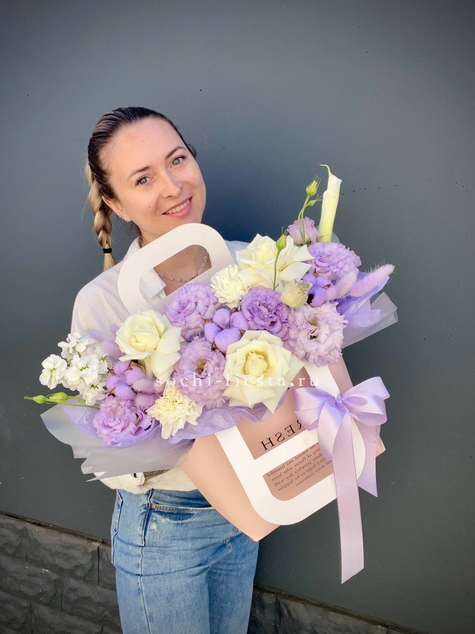 эустома, маттиола, белые розы, хлопок, лента, сумка-кашпо.