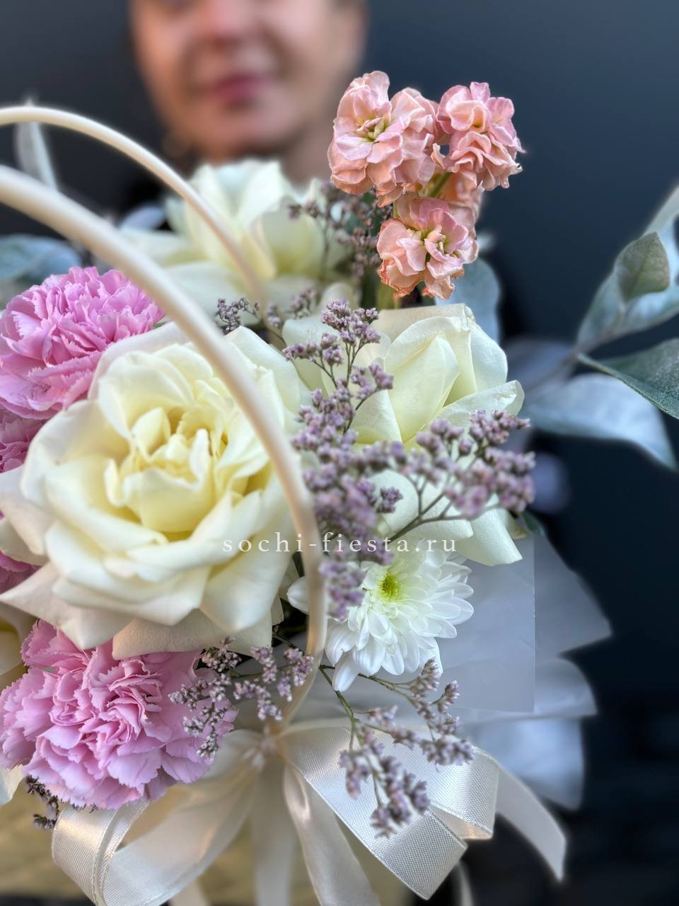 Герберы и маттиола вместе с диантусами выстраивают вертикальный ритм в flower bag. Белая роза и кустовая хризантема добавляют композиции завершенность.