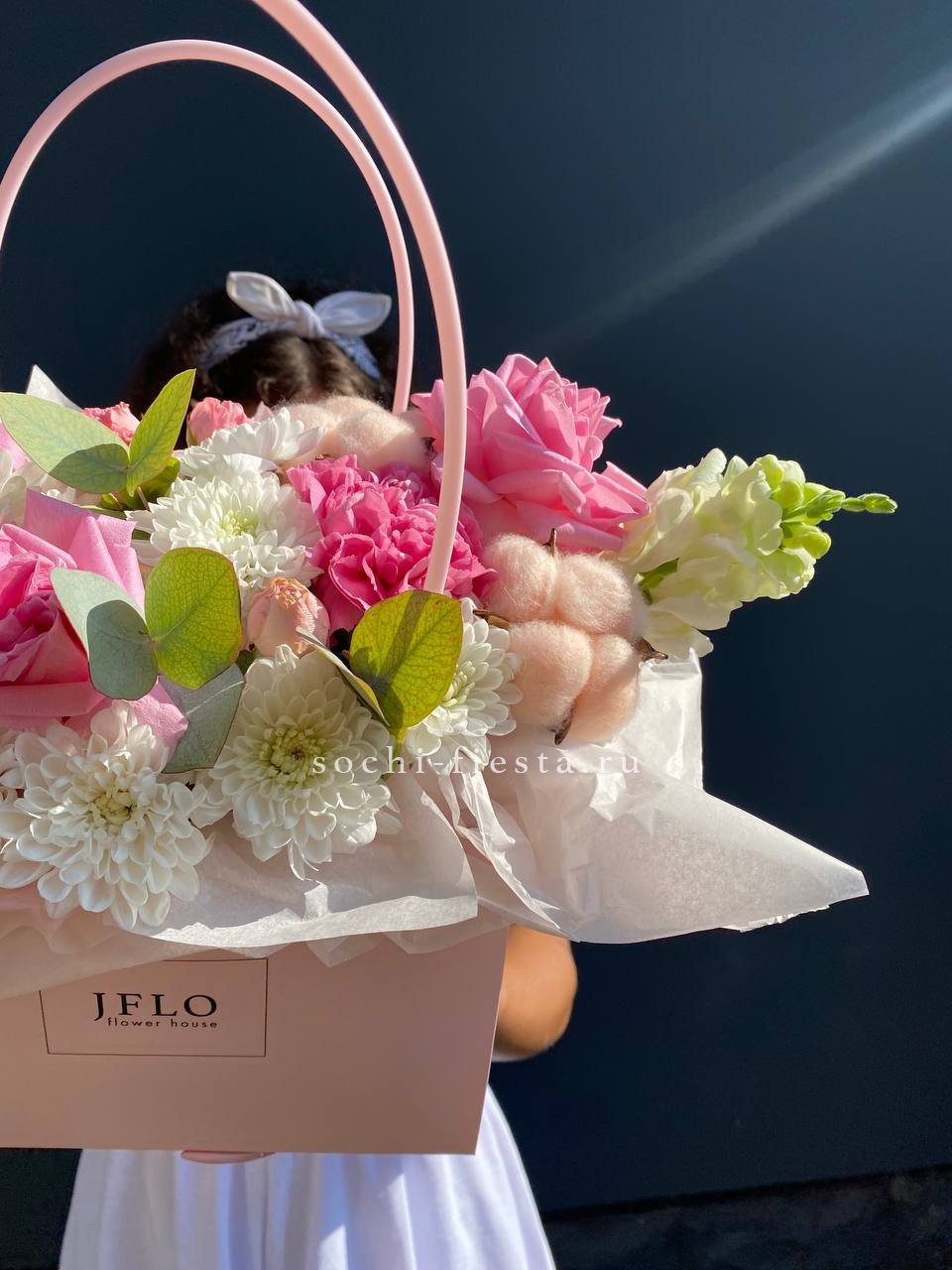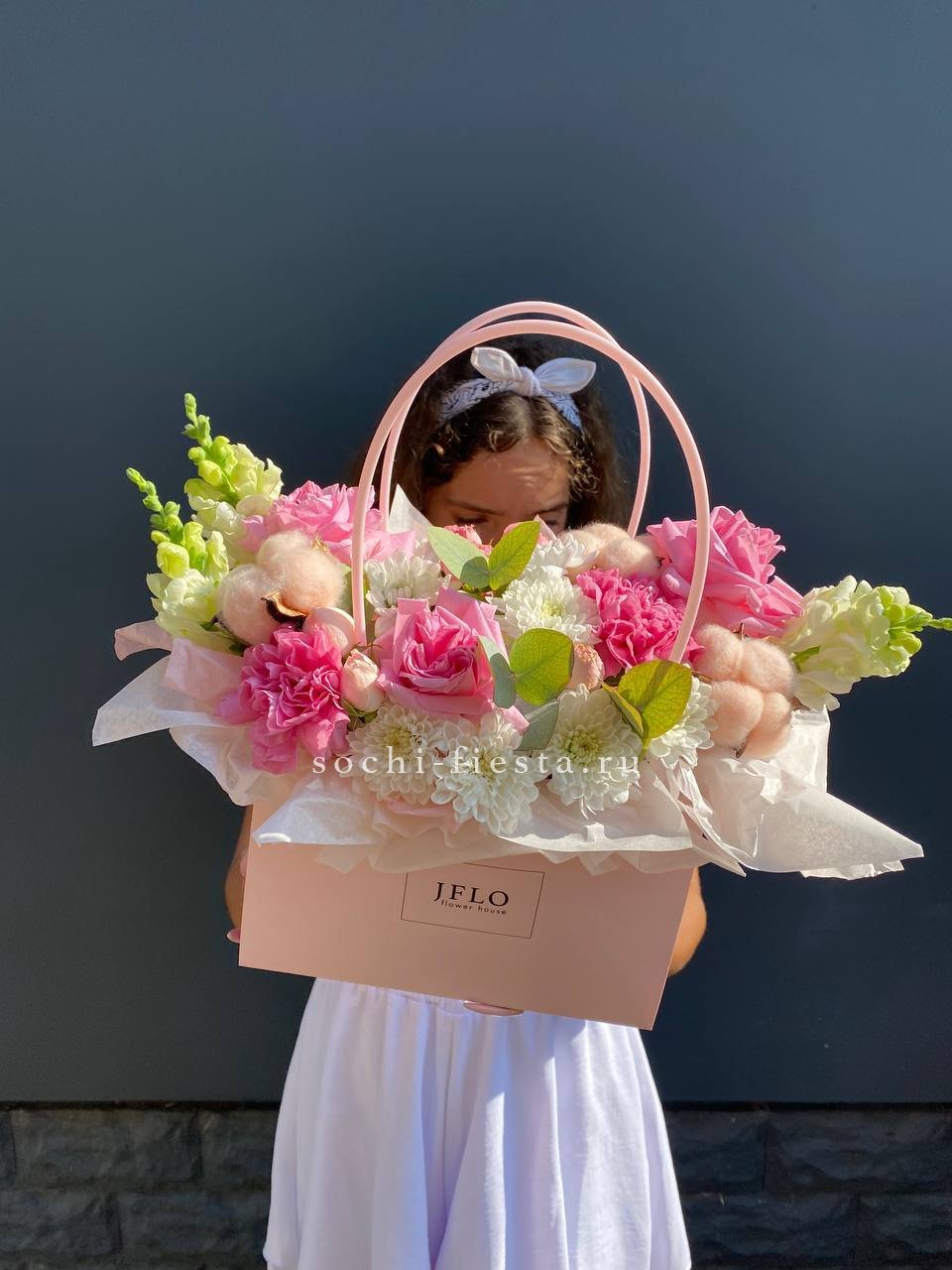Голубая гортензия задаёт тон всей композиции, где хризантема и эустома создают объём, а хлопок с лагурусом добавляют воздушности. Сумочка вмещает насыщенную палитру без перегруженности.