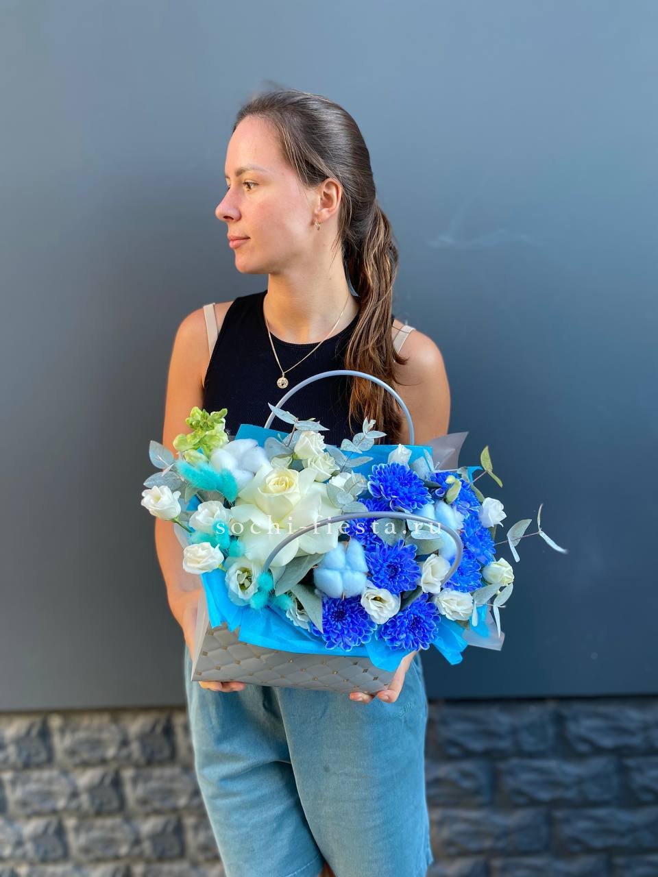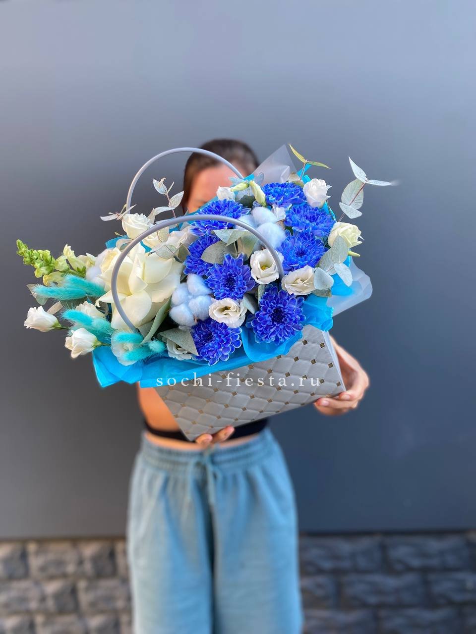 джумилия, гербера, мисти баблс, диантус, хлопок, лагурус, сумочка.