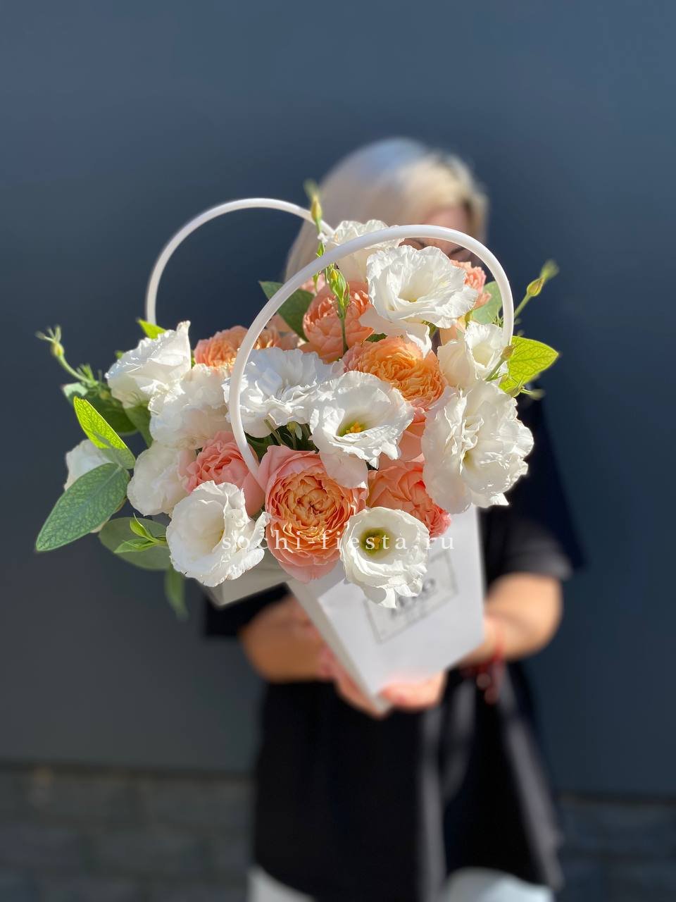 Пионовидные розы раскрываются пышными шапками рядом с воздушными соцветиями эустомы. Компактная форма сумочки удобна для вручения и не требует поиска вазы.