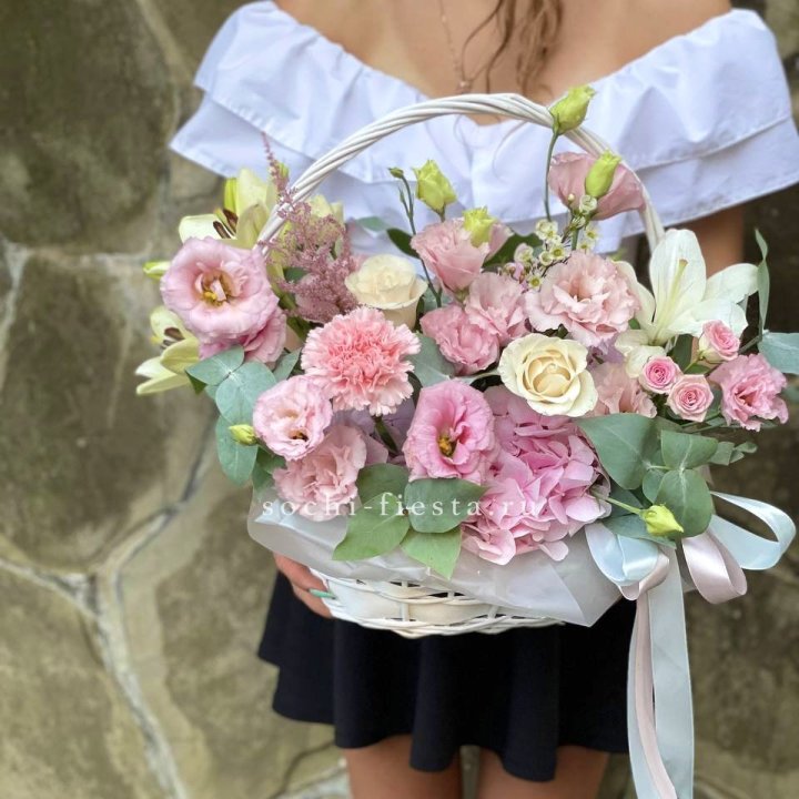 Состав корзин в Пскове определяется текущими поставками и сезоном. Розы Freedom, Mondial, Cappuccino — для классических куполообразных аранжировок. Пионы в мае-июне из свежих поставок: Sarah Bernhardt, Red Charm, Bowl of Cream — главный сезонный продукт. Хризантема, альстромерия, гербера — для объёмных торжественных наполнений. Эустома, ранункули — для садовых корзин. Флорист строит состав под конкретный запрос.