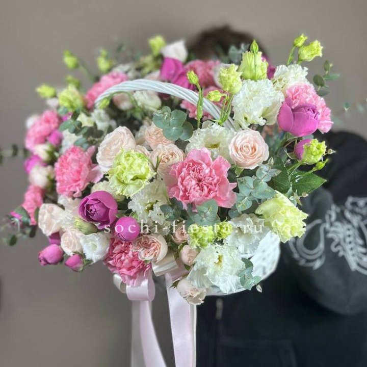 Состав корзин в Пскове определяется текущими поставками и сезоном. Розы Freedom, Mondial, Cappuccino — для классических куполообразных аранжировок. Пионы в мае-июне из свежих поставок: Sarah Bernhardt, Red Charm, Bowl of Cream — главный сезонный продукт. Хризантема, альстромерия, гербера — для объёмных торжественных наполнений. Эустома, ранункули — для садовых корзин. Флорист строит состав под конкретный запрос.