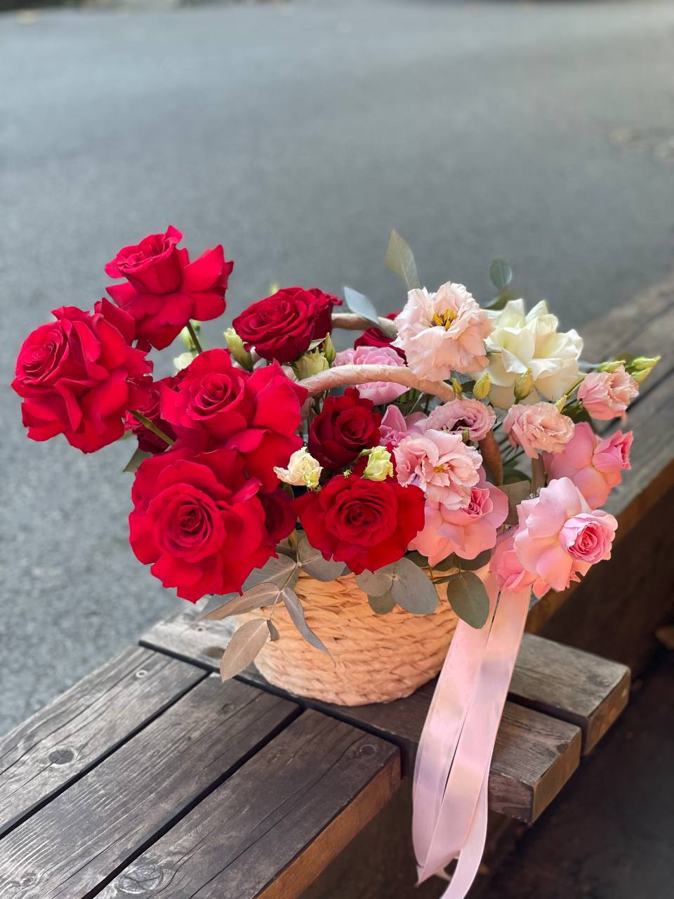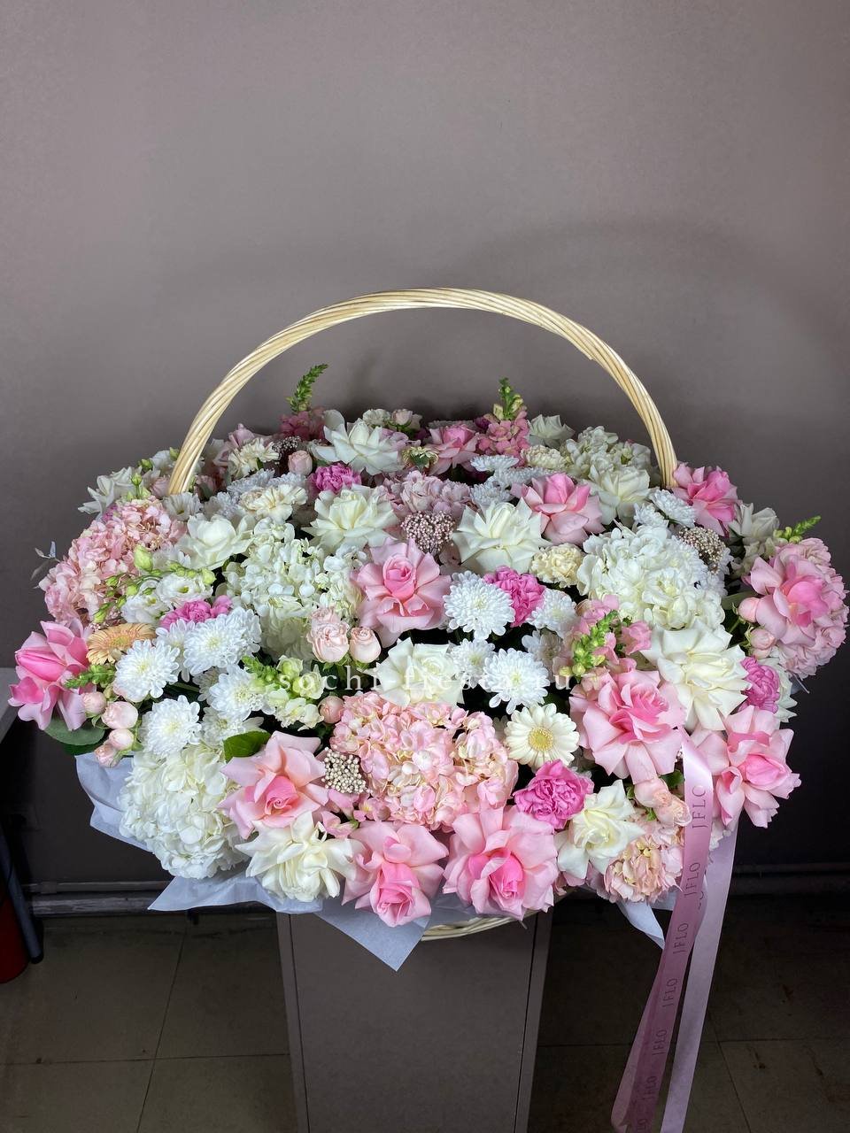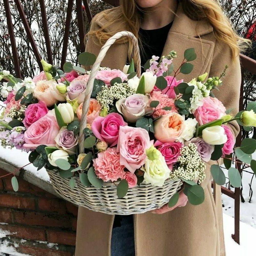 Восемь видов цветов складываются в harmonичную композицию со светлой корзиной в основе. Диантусы и эустома перекликаются с розами, а гортензия задает мягкий объем всей структуре.