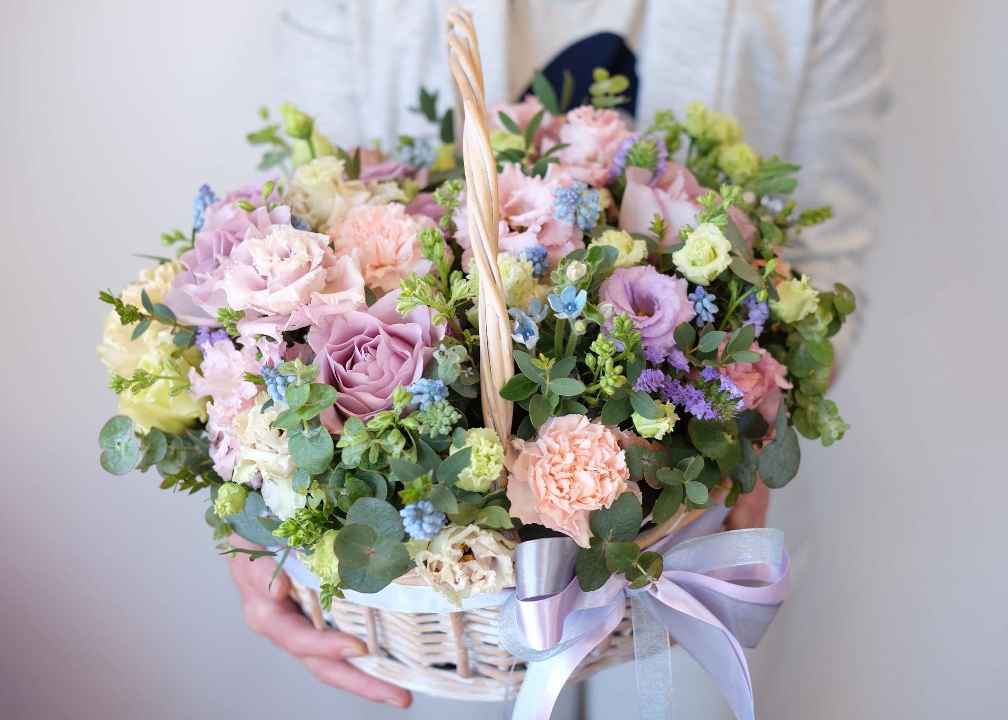 Корзина объединяет гортензии, эустомы, розы и маттиолу в многослойную композицию. Разные фактуры лепестков создают визуальную глубину и насыщенность.