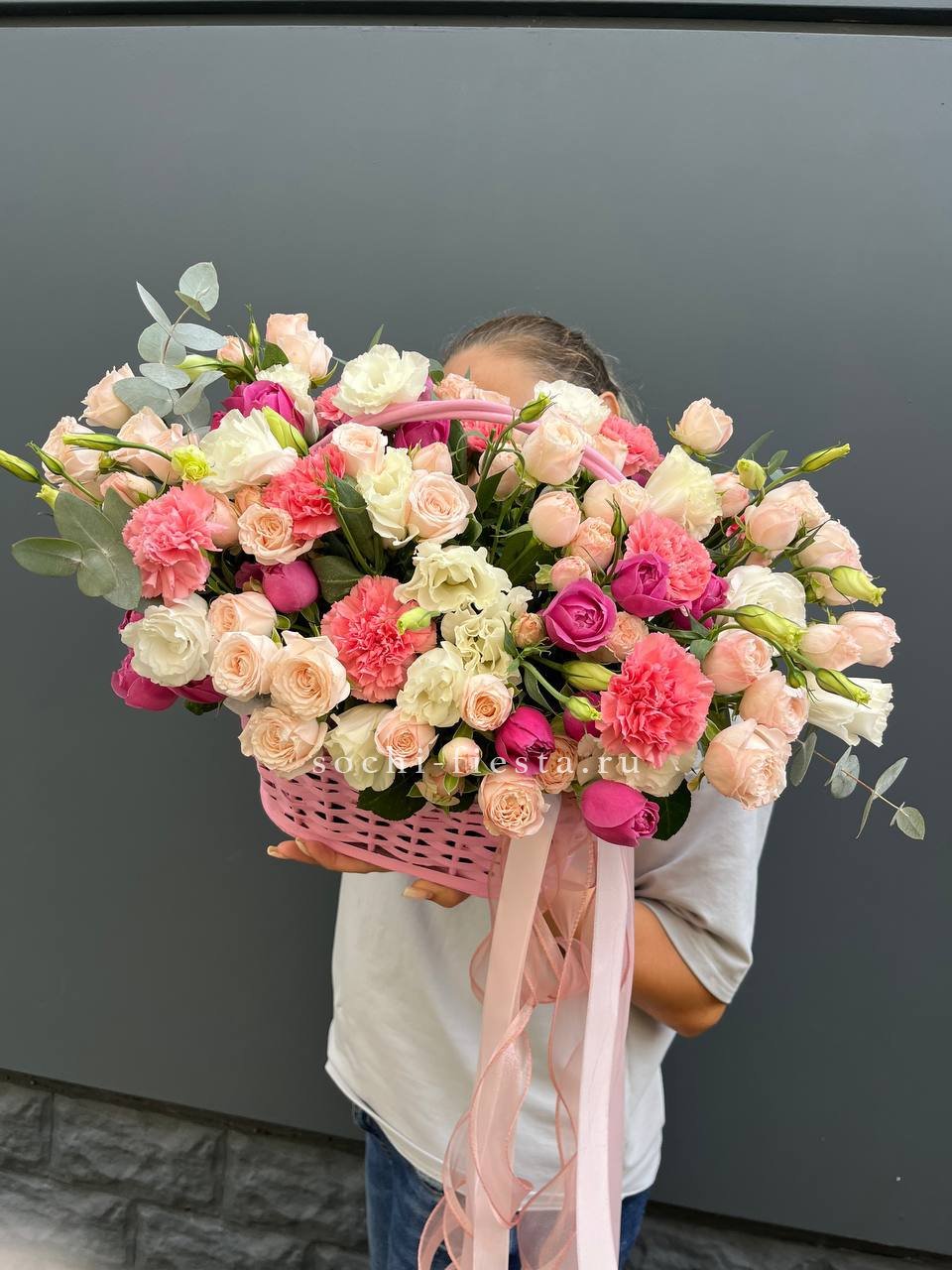 розы кустовые, диантусы, эустома, лента, корзина D35.
