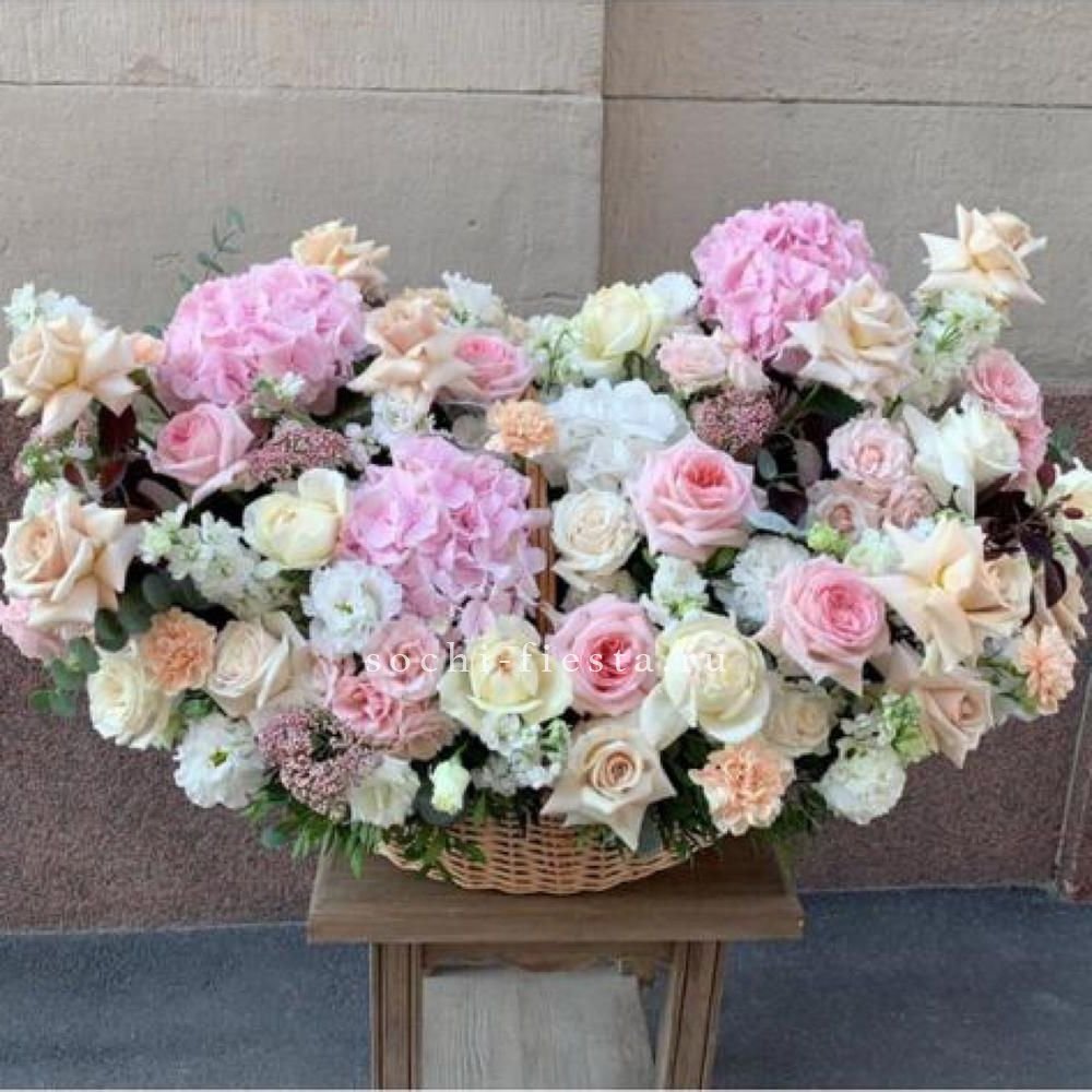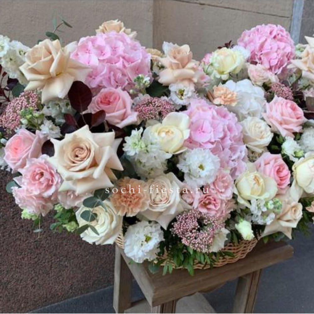 Пышная корзина с крупными бутонами роз, лилий и гортензий создаёт объёмную композицию с плавными переходами между соцветиями. Пионы добавляют воздушности и мягкости всей форме.