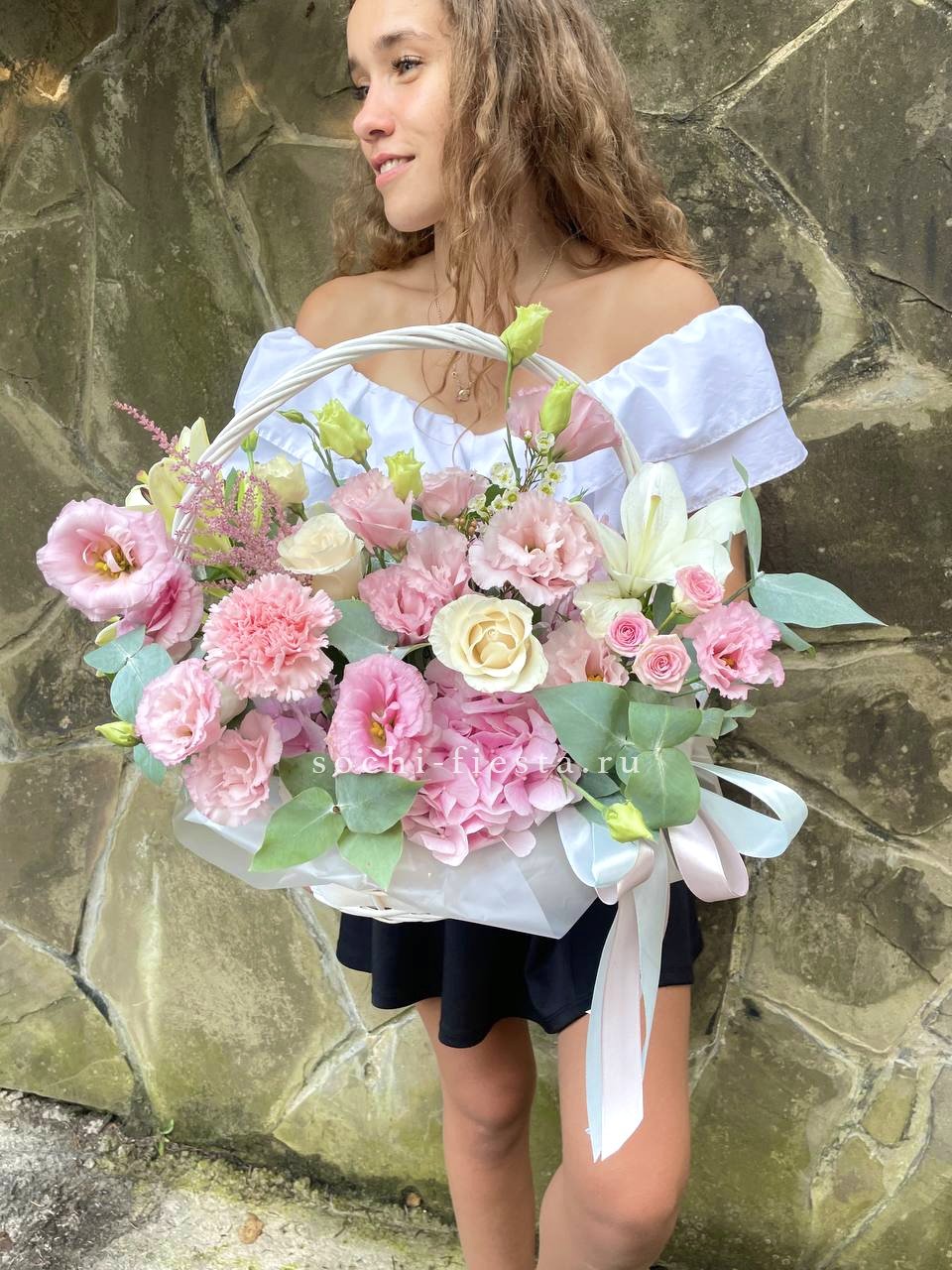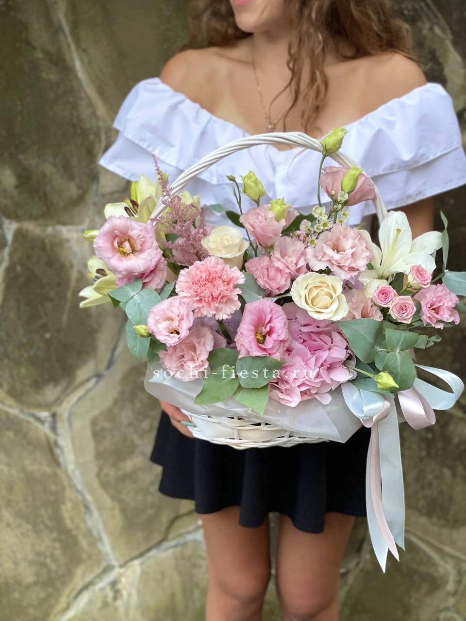 Пышные пионовидные розы Мисти Баблс и бомбастик создают объёмное облако в естественной плетёной корзине. Диантусы и статица добавляют воздушности, а эвкалипт завершает композицию свежими нотами. Яркое присутствие в любом пространстве.