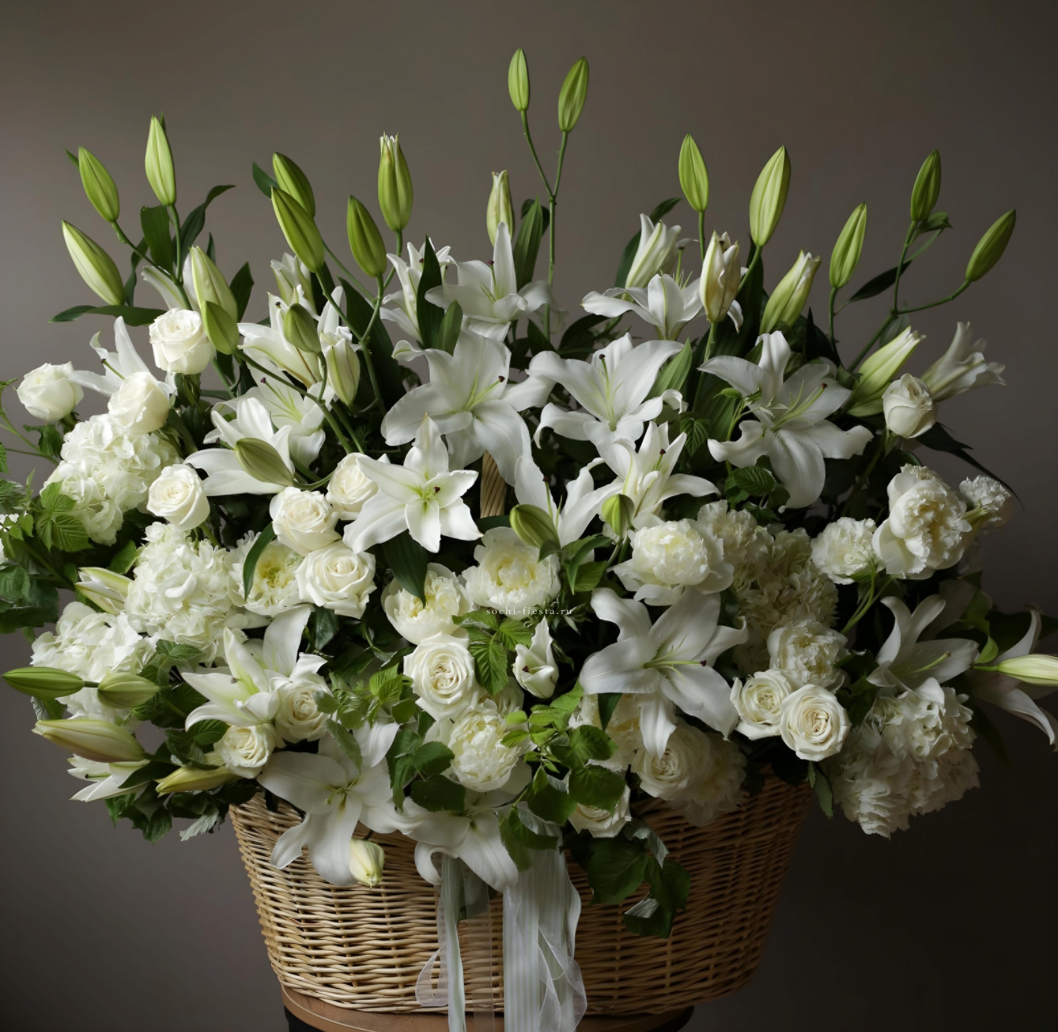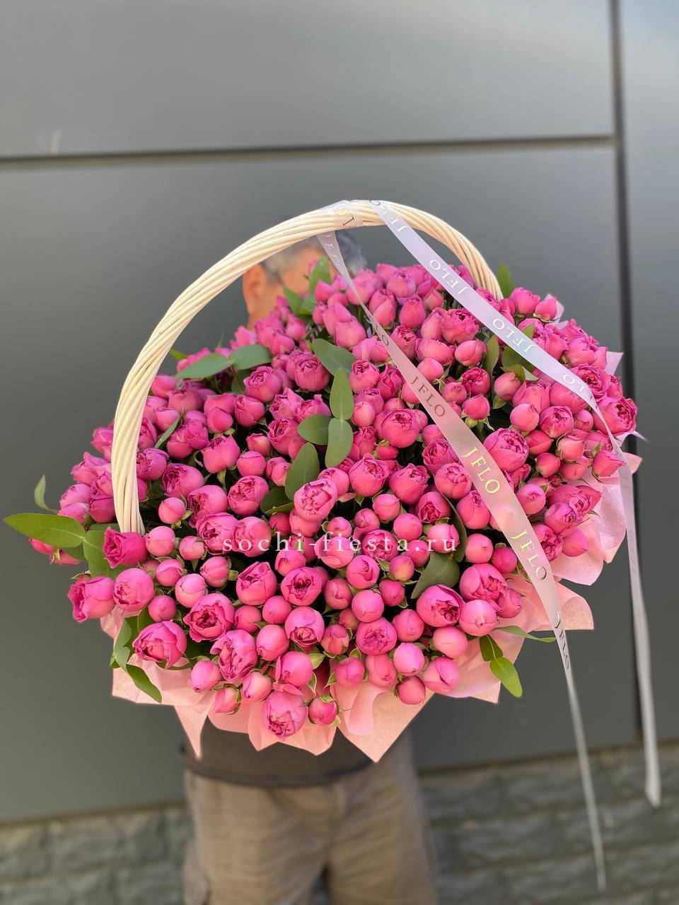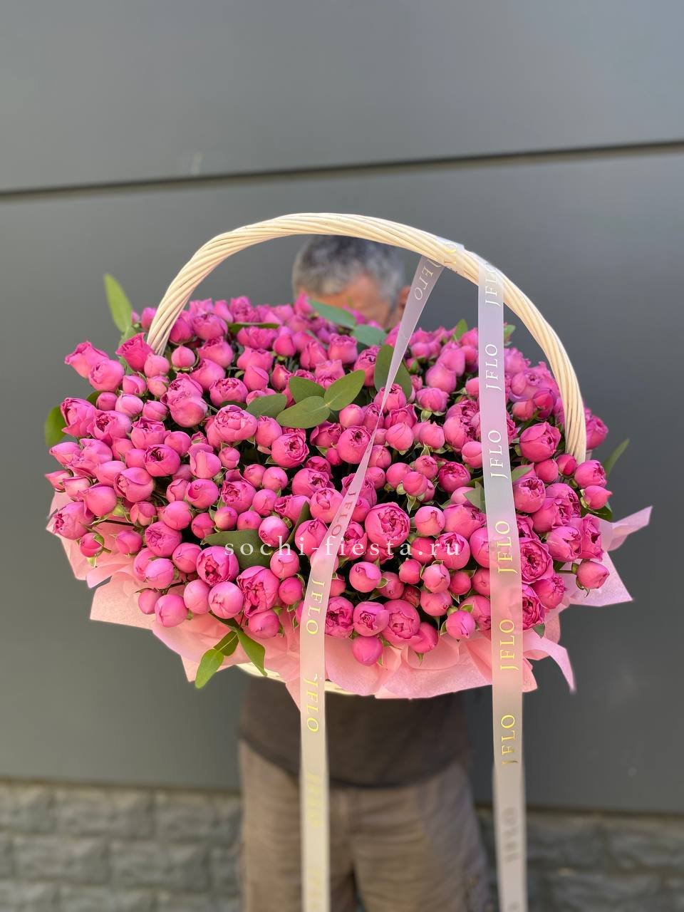 Сорок одна пионовидная роза в светлой корзине выстраивает объёмную композицию с мягкими переливами лилового и розового. Эвкалипт обрамляет густую россыпь бутонов.