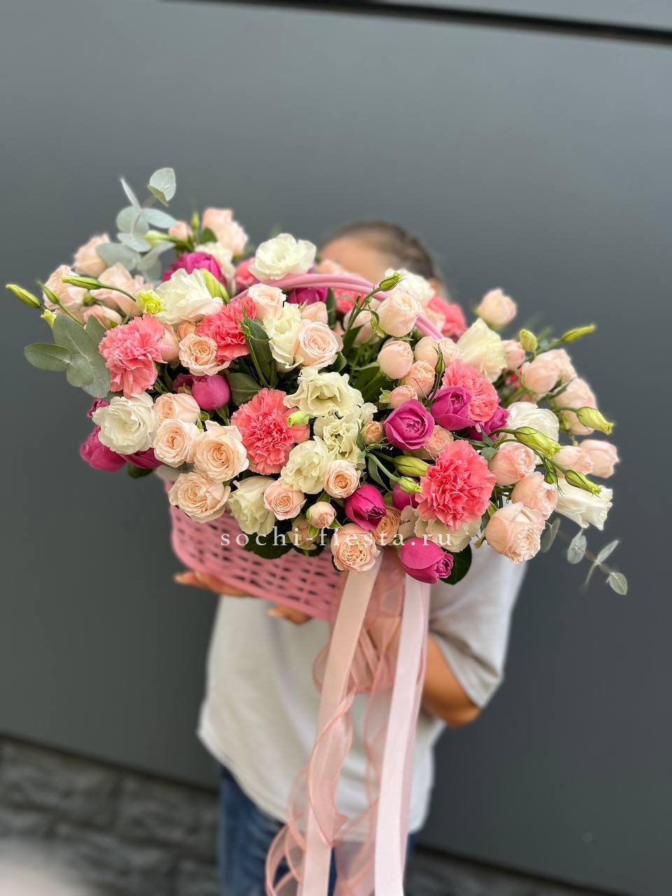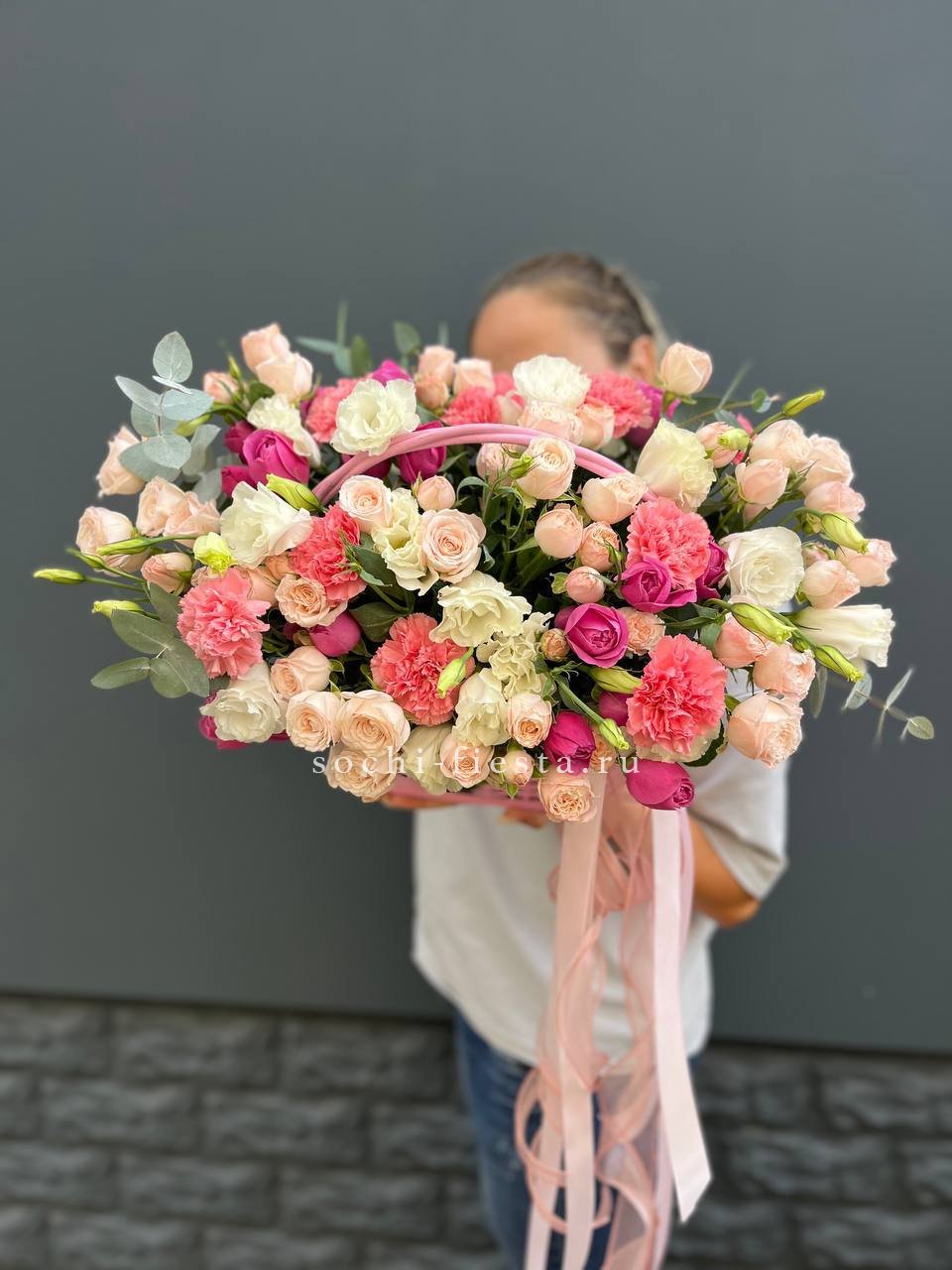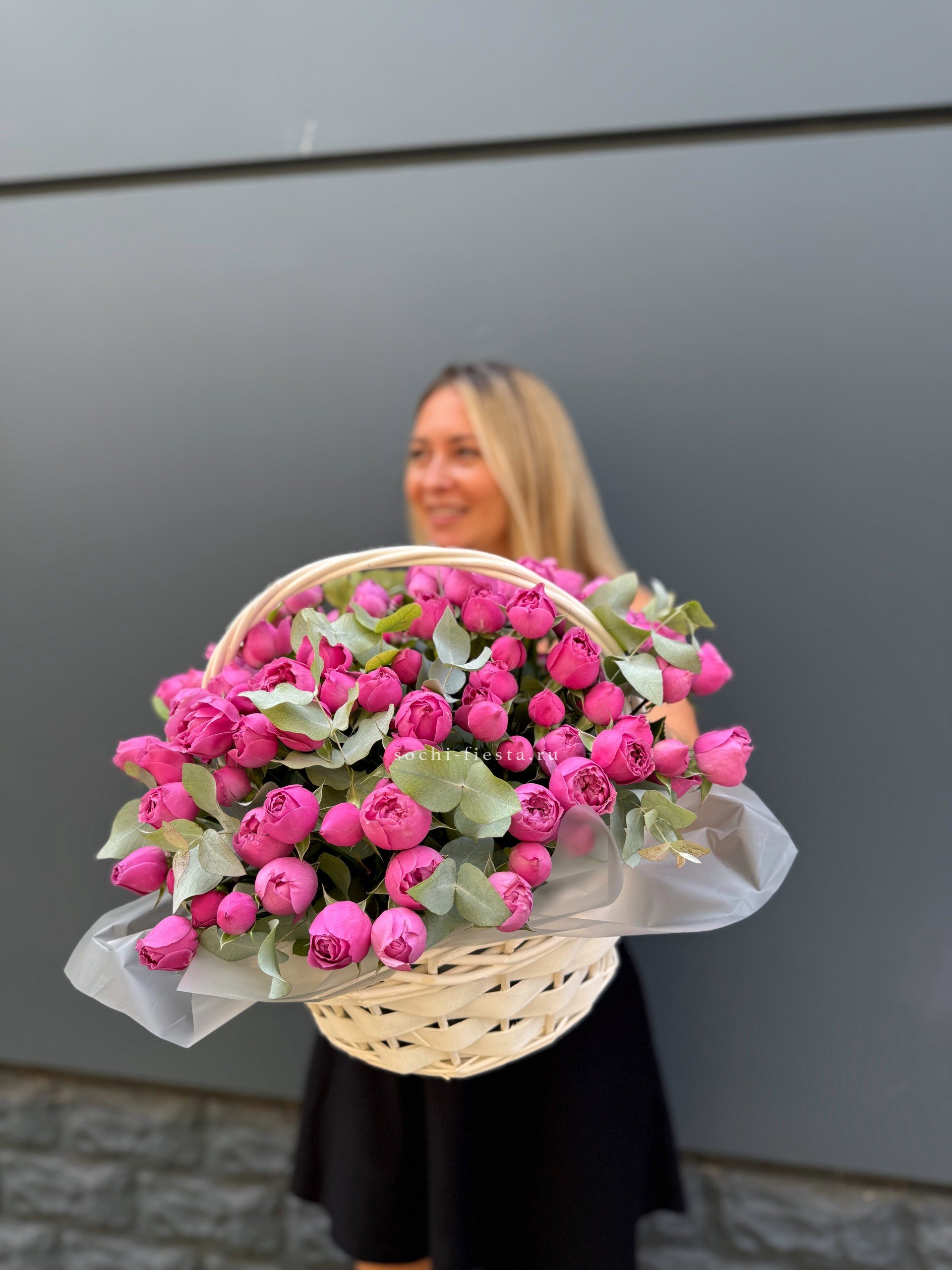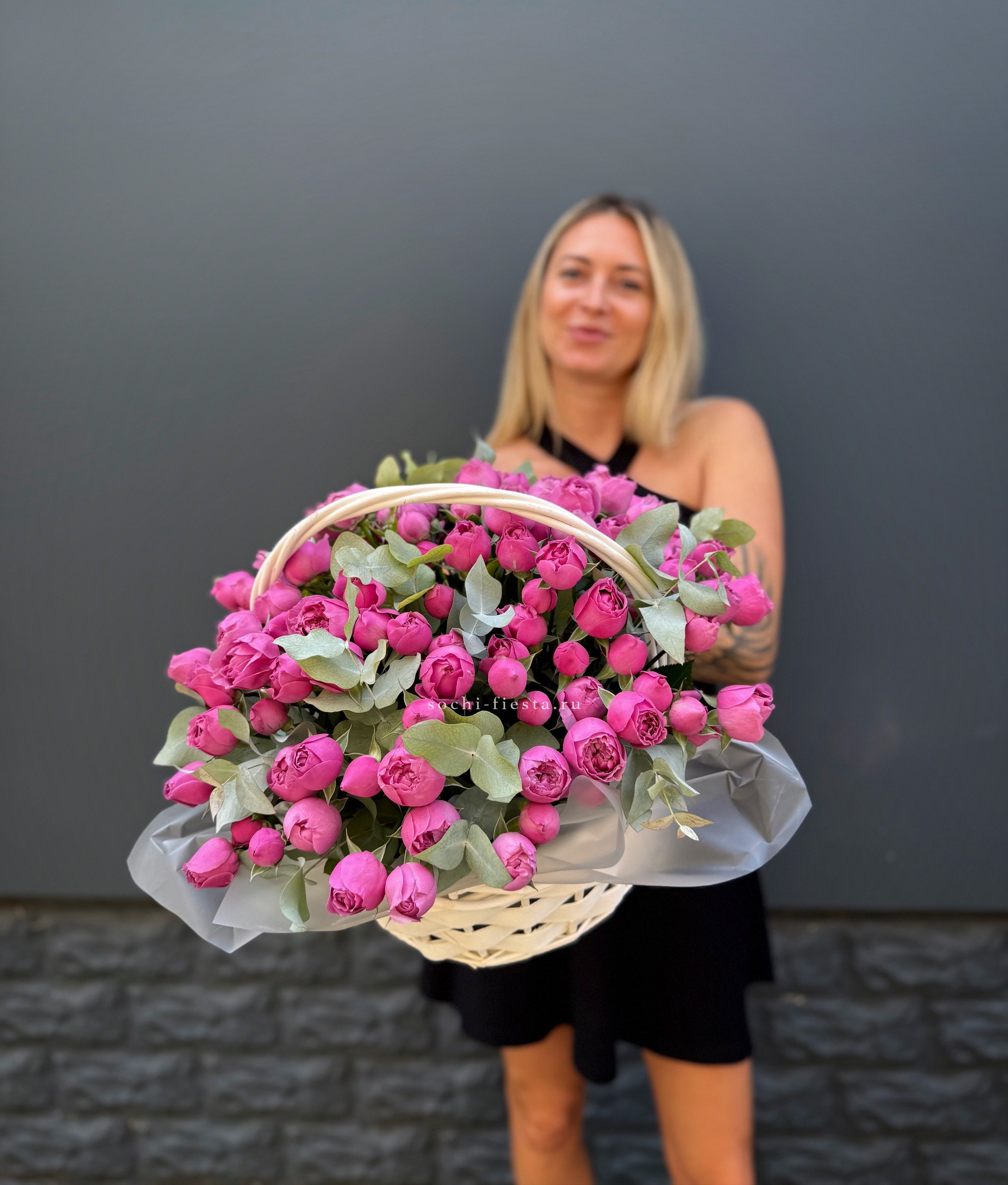 41 пионовидная кустовая роза Misty Bubbles, эвкалипт, светлая корзина.