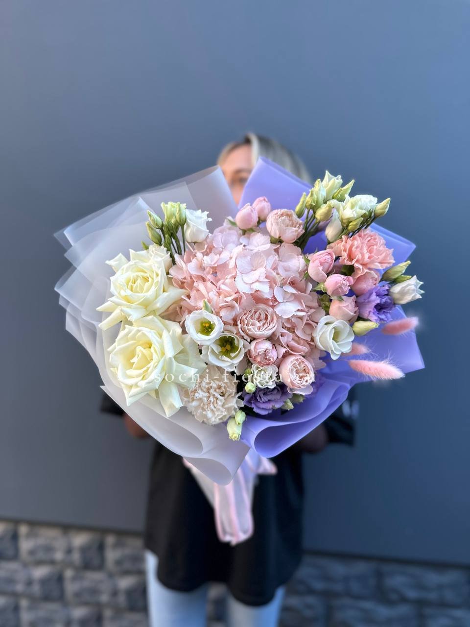 Пятьдесят один бутон Мисти Баблс собраны в плетёную корзину и образуют плотную цветущую полусферу. Лавандовые оттенки раскрываются постепенно и держат форму долго.