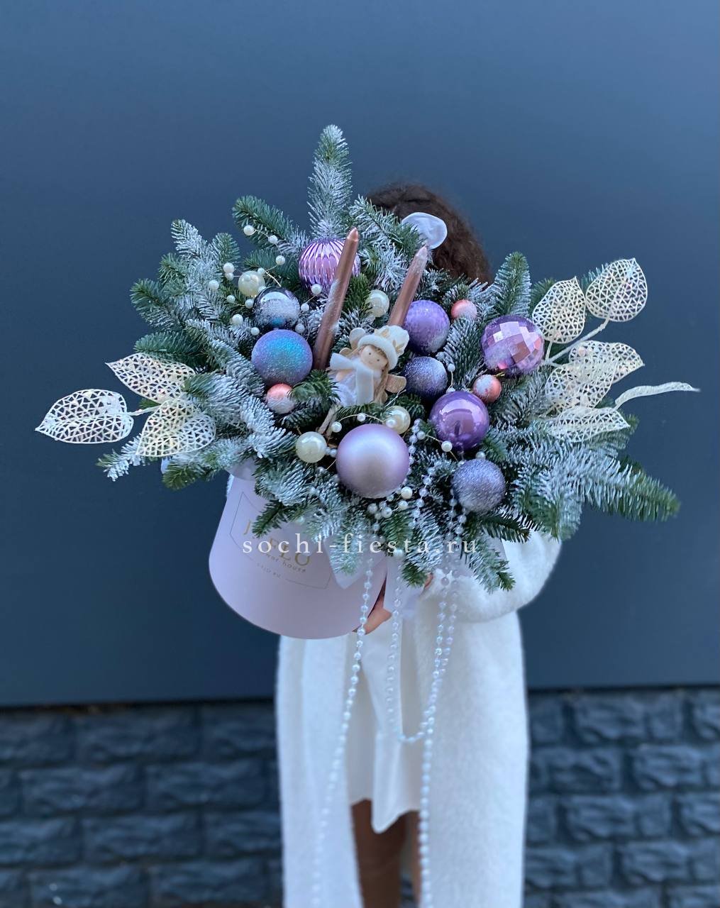 Ветки нобилиса обрамляют свечи и новогодние игрушки, создавая вертикальный силуэт с плавными переходами. Композиция выстроена так, что взгляд движется от основания к верхушке. Форма держится плотно и аккуратно.