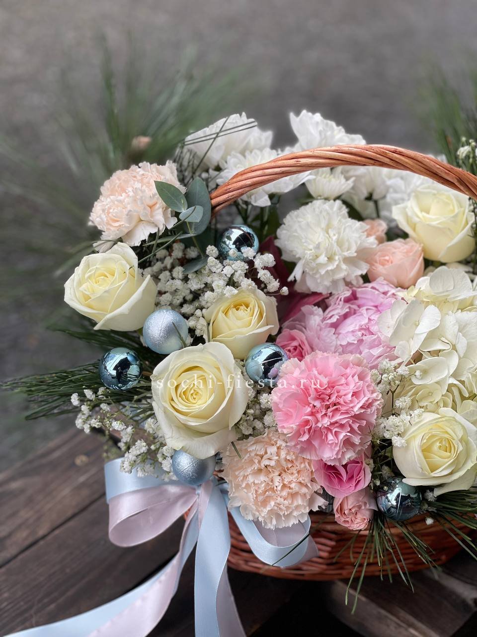 гортензия, роза, игрушки, хризантемы, диантусы, гипсофила, ель, бомбастик, корзина, оазис, лента.